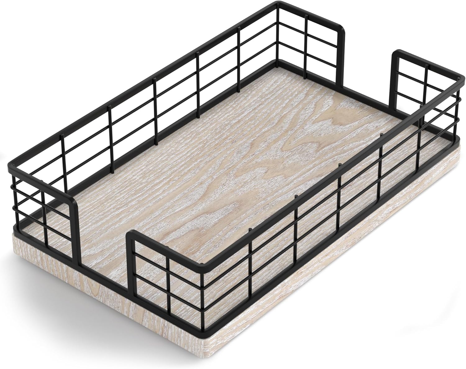 Wican Guest Towel Holder Tray for Bathroom, Ash and Iron Napkins Holder for Powder Room Dinning Table Wooden Basket for Disposable Paper Hand Towels Black and Ash Whitewashed