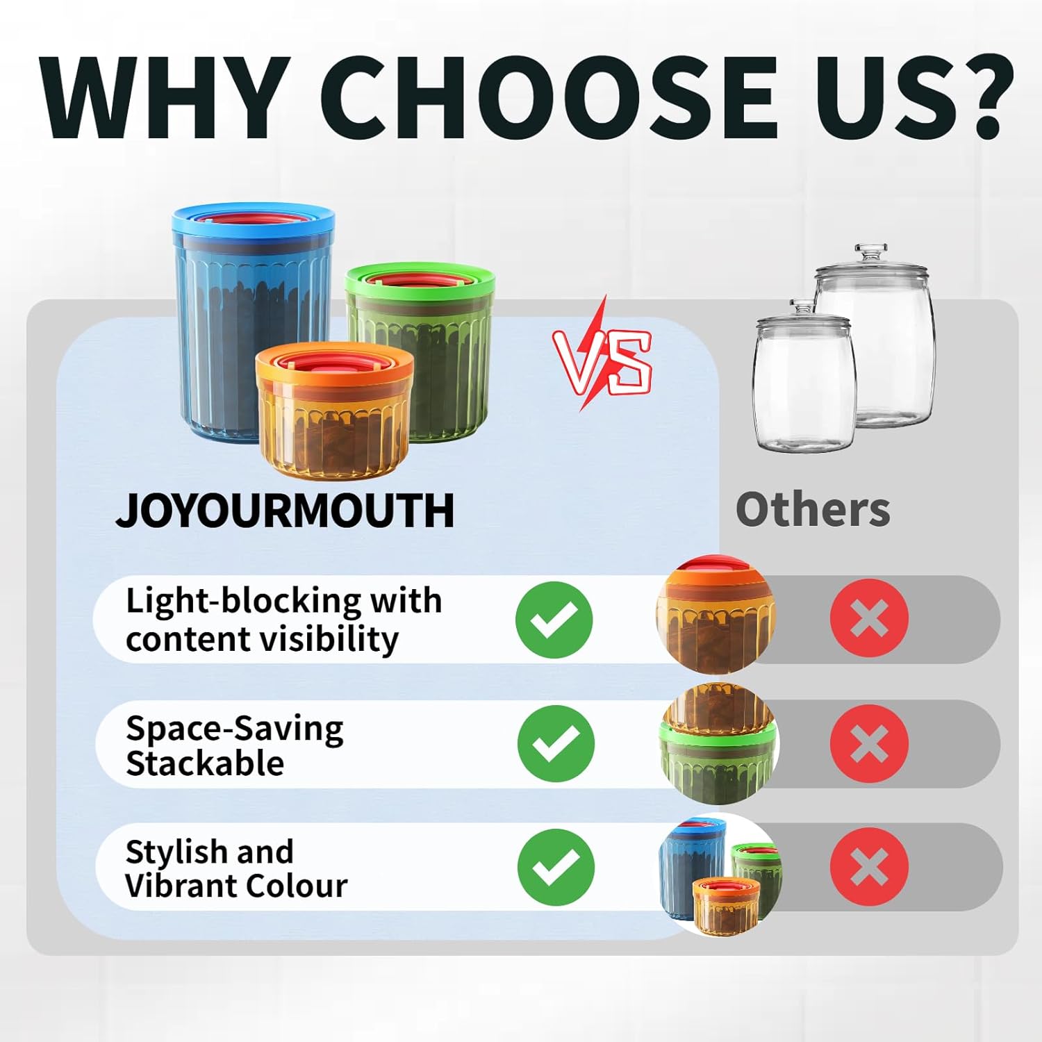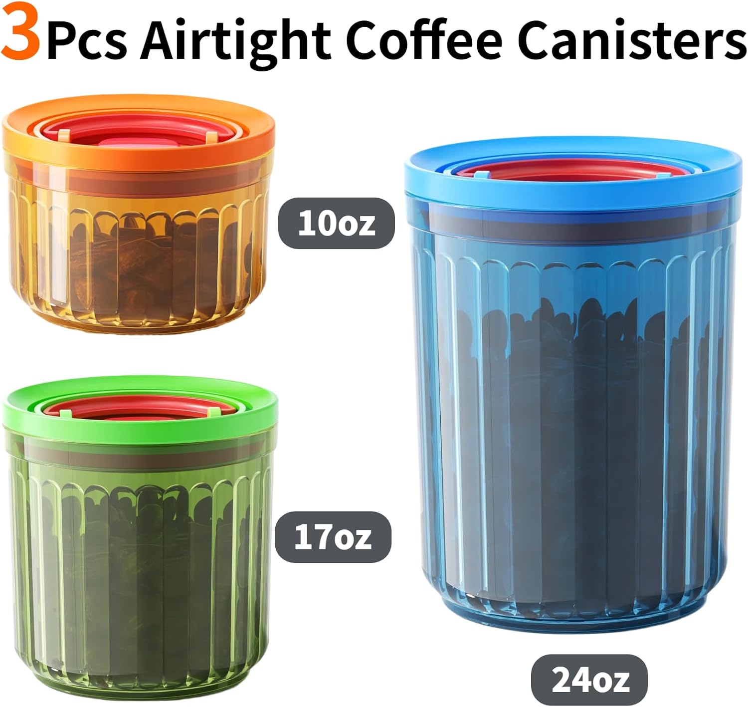 - 2. Stylish and Vibrant Color Options,Light-Blocking Design:Available in Vibrant,Bright and cheerful color options (orange10oz, green17oz, blue24oz), making it easy to categorize coffee types,sugar,beans,snacks,while adding a pop of color to your space.Dark-tinted yet transparent canisters block UV rays while allowing content visibility,allowing easy content checks without compromising freshness