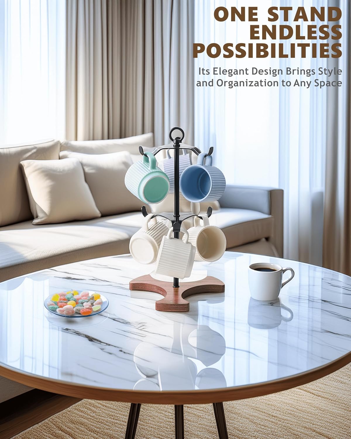 - ✅ MORE THAN A COFFEE MUG STAND | VERSATILE HOME ORGANIZER. Unleash your creativity! This stylish stand is more than just a mug rack for your countertop; it's a brilliant multi-purpose organizer. Use this versatile cup stand in your entryway to hang keys, in your bedroom for necklaces and bracelets, or on your desk for headphones. It’s a chic and practical solution for tidying up small items, adding organized elegance to any room.