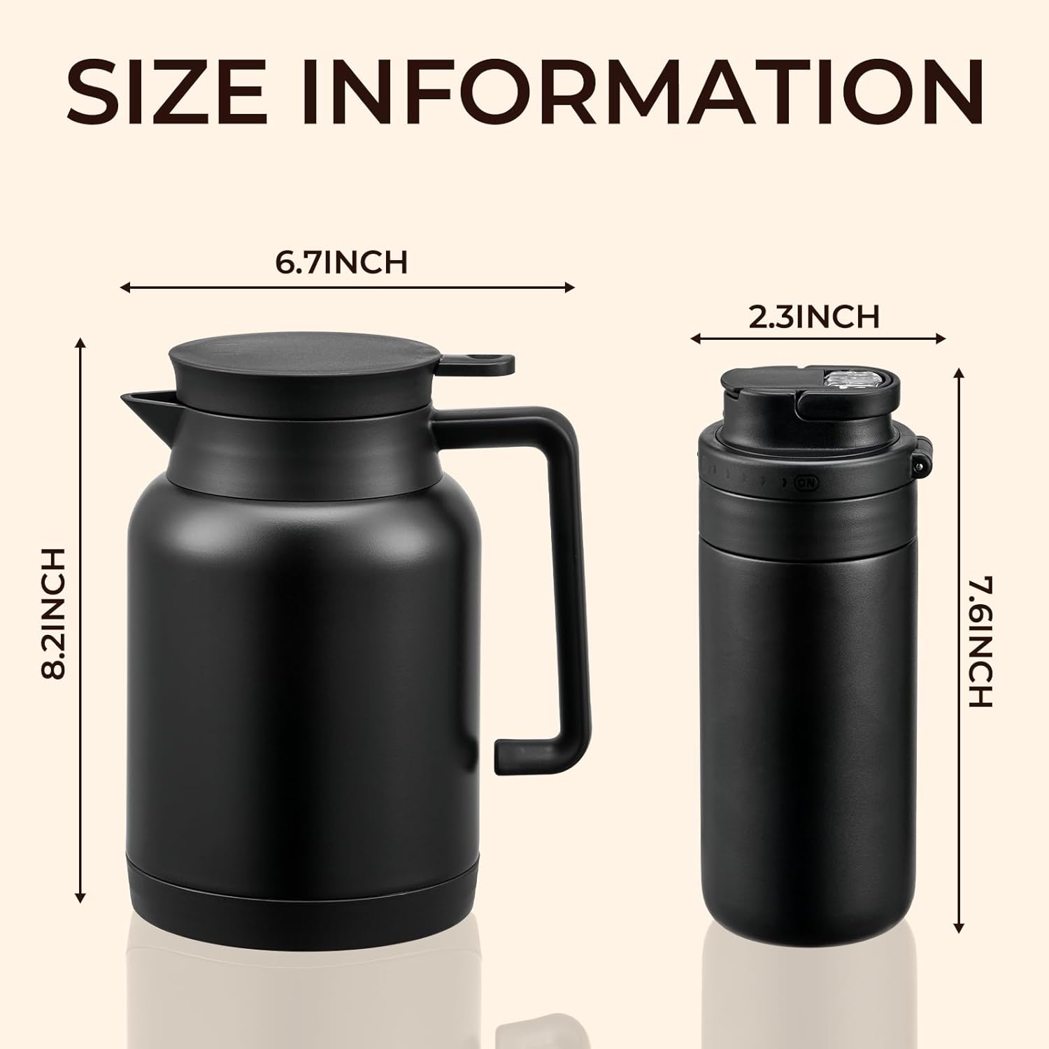- 【PREMIUM TEMPERATURE RETENTION】This coffee carafe and water bottle uses advanced trlple layer vacuum insulated technology to lock the temperature, coffee carafe keeps drinks hot for 12+ hours and cold for 24+ hours. water bottle keeps hot for 8+ hours and cold for 12+ hours. Enjoy perfectly brewed coffee or refreshing iced water anytime, anywhere.