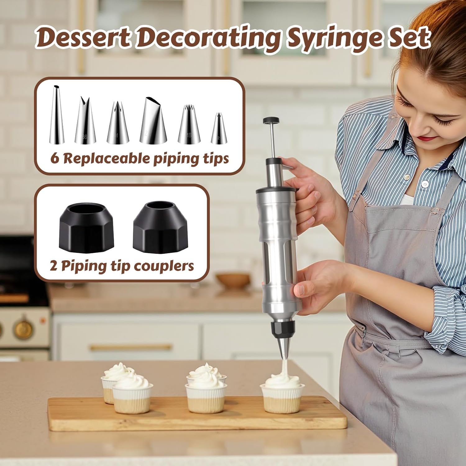 Dessert Decorating Syringe Set, Stainless Steel Frosting & Icing Piping Kit with 6 Tips and 9 Silicone Cupcakes,3 Cream Scraper for Cake Decorating Tools Cupcake Decorating Kit