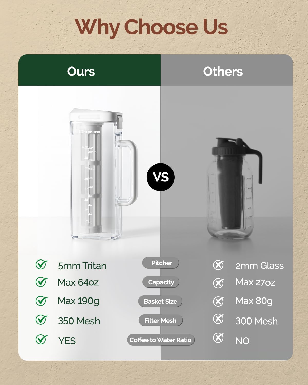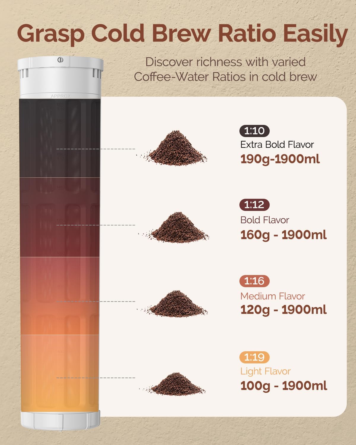 - Grasp Cold Brew Ratio Easily: Experience the art of precision brewing with our cold brew pitcher! When using 190g, 160g, 120g, and 100g of coffee grounds with the same time and water quantity, each ratio creates a distinct coffee concentration. Unlock the potential for customized cold brew strength, allowing you to savor the nuanced flavors according to your preference. Elevate your cold brew experience with our versatile pitcher.