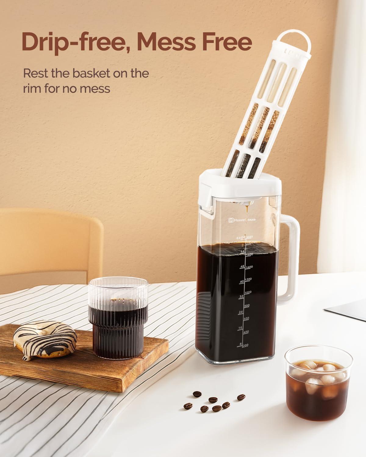 Maestri House Compact Cold Brew Coffee Maker, 64oz Iced Tea and Coffee Maker Brewer Space Saving Tritan Pitcher, 350 Mesh Filter, 100% Leak-Proof
