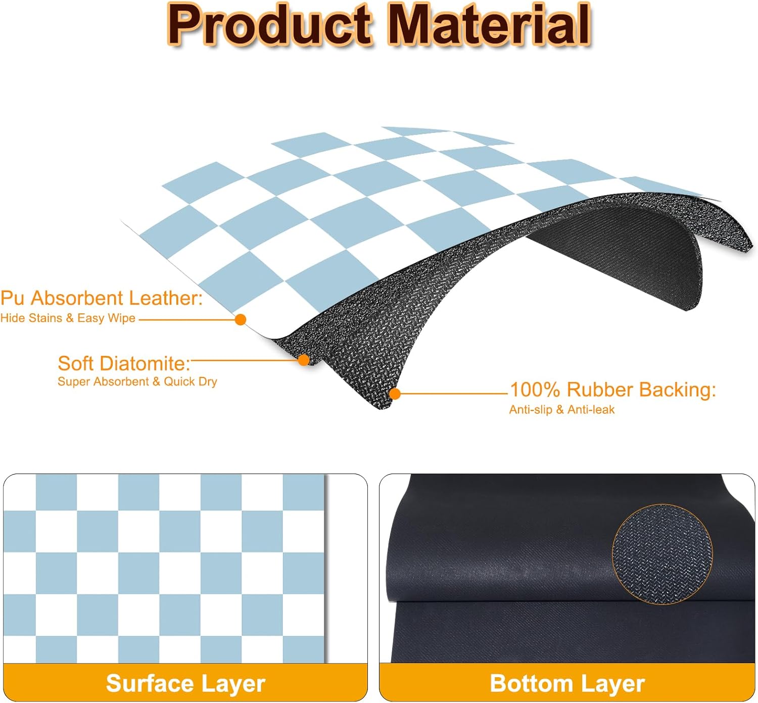 Dish Drying Mat for Kitchen, 15.7'' x 23.6'' Checkered Coffee Bar Mat for Countertops, Coffee Station Mat with Non-slip Rubber Backed, Absorbent Dish Dying Pat for Kitchen Counter, Blue & White