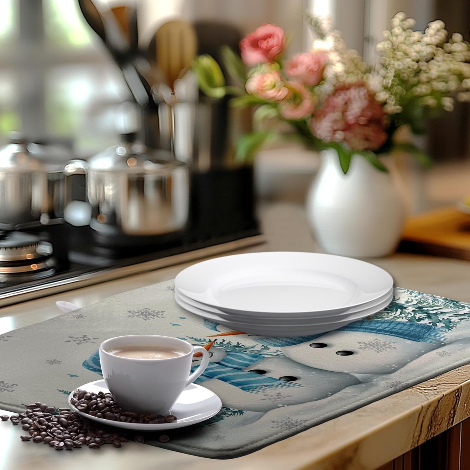 - [Multi-functional]: This Snowman Xmas Tree dish drying mat can be placed under the dish rack to collect dripping water to keep the counter dry and clean, or you can place bottles, pots, plates, bowls, cups and other utensils directly on the mat. Blue Snowman Christmas Rustic Large dish drying mat can also be placed under the coffee machine to absorb spilled coffee.