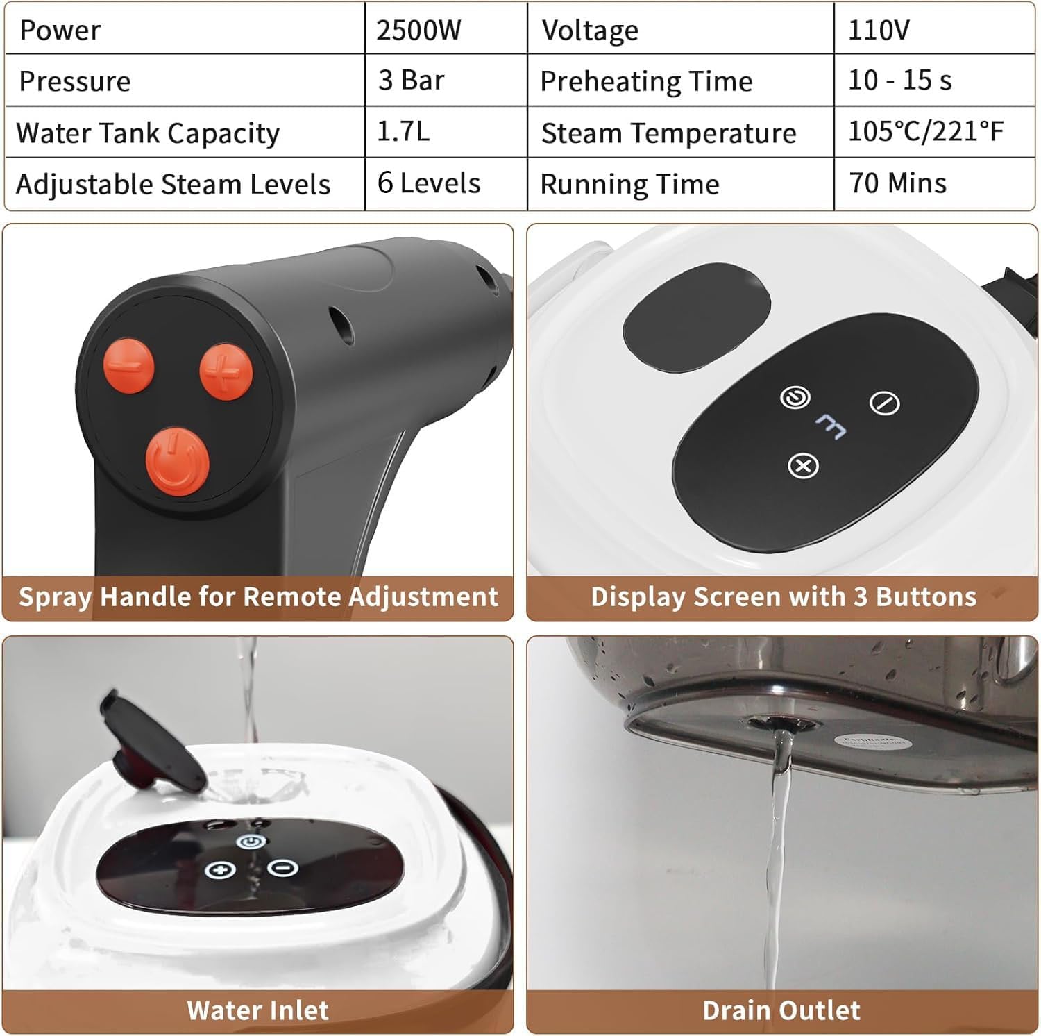- High-Capacity Water Tank: Featuring a 1.7L water tank, this steam cleaner for home supports up to 60-70mins of continuous cleaning, reducing the need for frequent refills and enhancing efficiency; Warm Note: You could add water anytime and take this pressurized handheld steam cleaner anywhere during it is operating