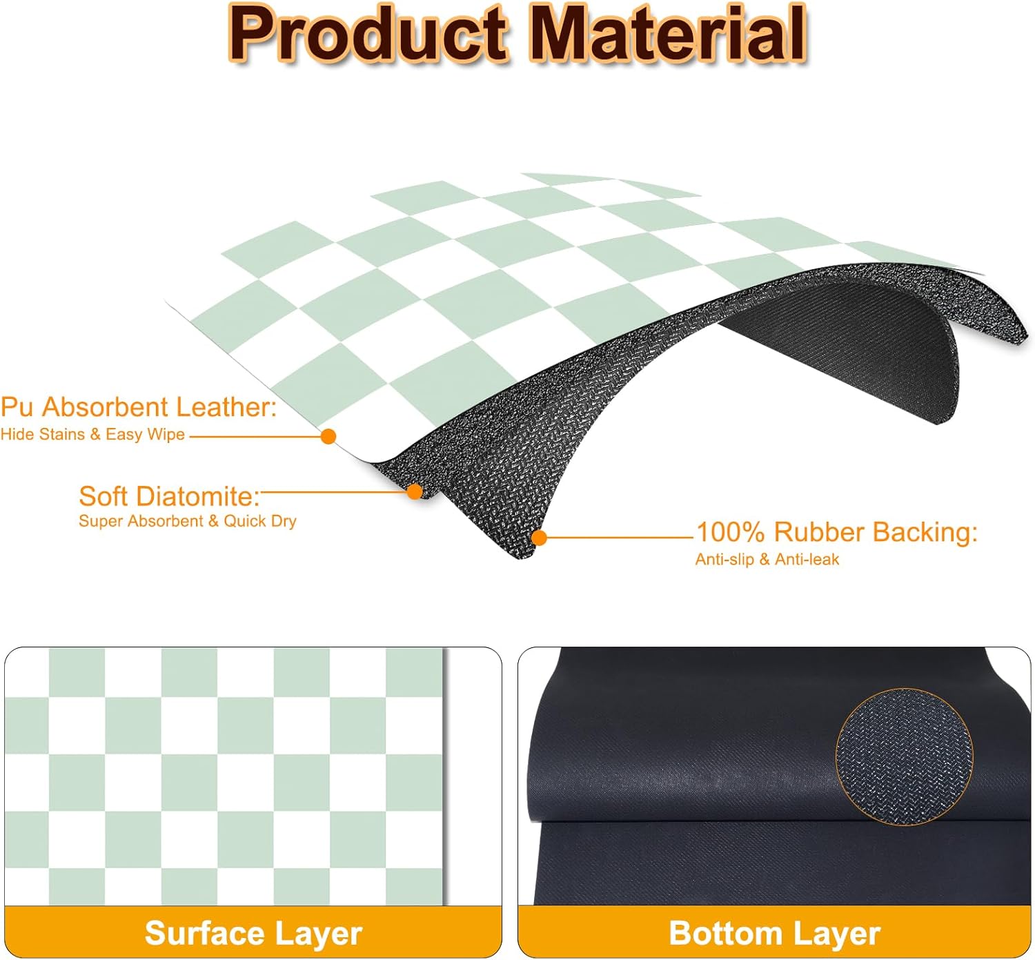 Dish Drying Mat for Kitchen, 15.7'' x 23.6'' Coffee Bar Mat for Countertops, Checkered Coffee Station Mats with Non-slip Rubber Backed, Absorbent Dish Dying Mat for Kitchen Counter, Green & White