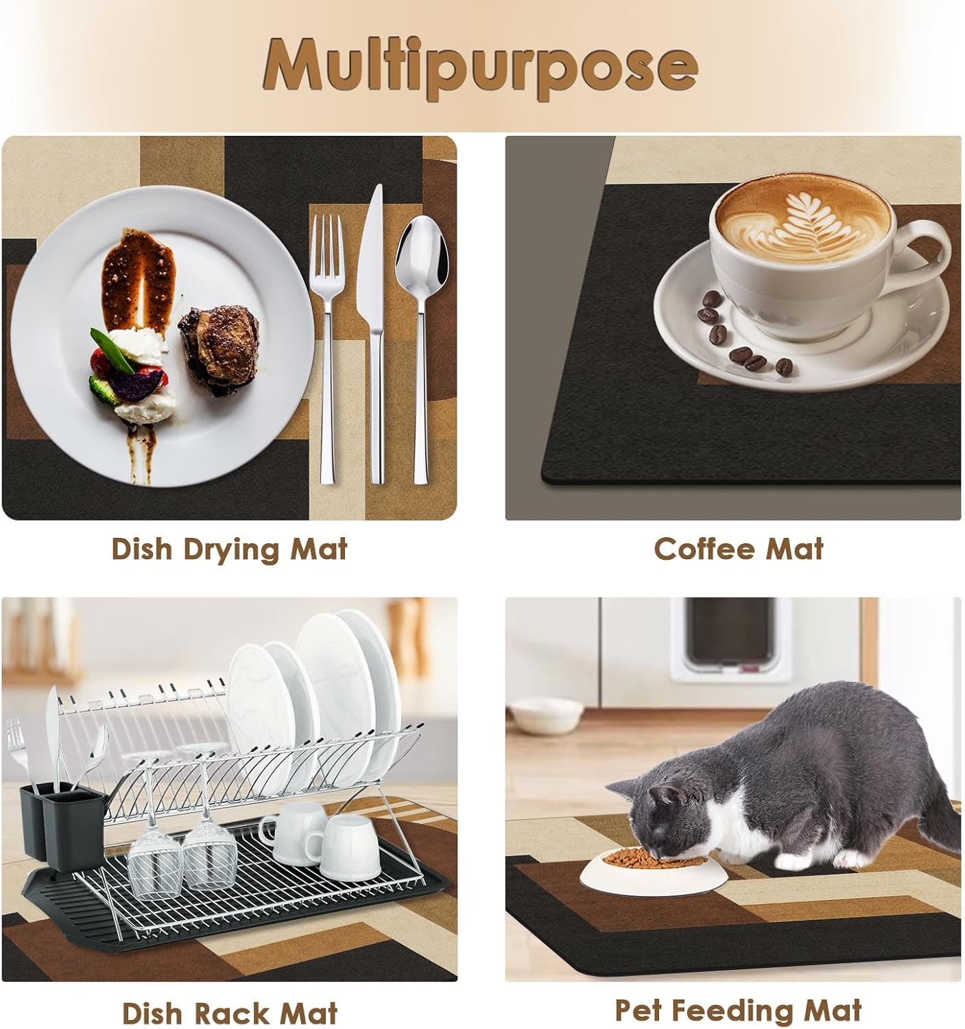 - [Multi-Purpose] This coffee mat is not only as coffee station accessories, but also great for dish drying matfor kitchen countertop, cups, water dispensers, mixers, ice cream machines, dish washing racks, dinner plates, tableware.Also can be used as pet feeding mat, under sink mat, door mat or placemat.So it's the perfect coffee accessories for apartment must haves.