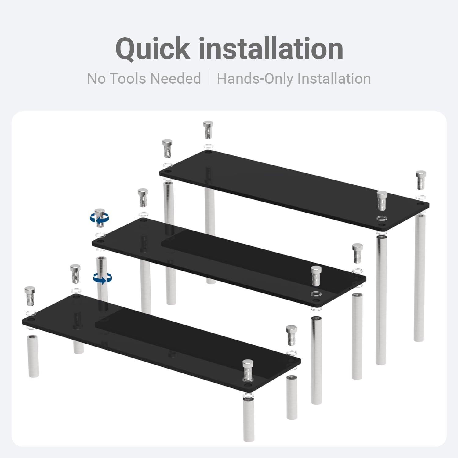 - Tool-Free Assembly – No screwdriver needed! Assemble this 3-tier riser in minutes using pre-cut acrylic panels and stainless steel supports. Disassembles flat for storage.
