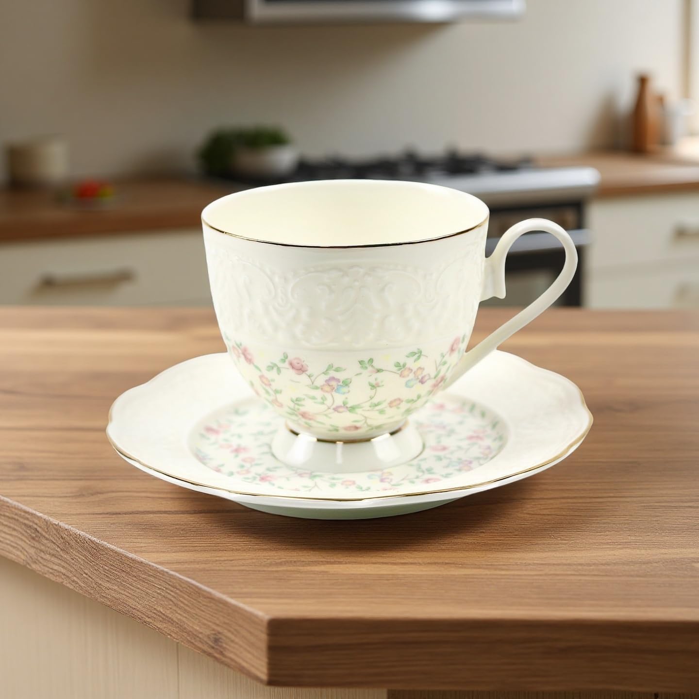 TATSUMI Interglio Embossed Bone China Tea Cup and Saucer Set, 3 Pieces Vintage Style Coffee Cup & Saucer Set For Women Wedding Gift (Starlight Pink, 1 set)