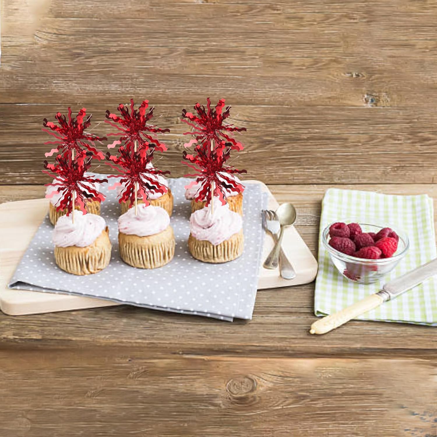 30 PCS Foil Firework Cupcake Toppers Sparkle Tinsel Cupcake Picks Happy Birthday Cake Toppers Drink Stirrers Cocktail Food Fruit Toothpicks for Baby Shower Birthday Party Decorations Supplies Red