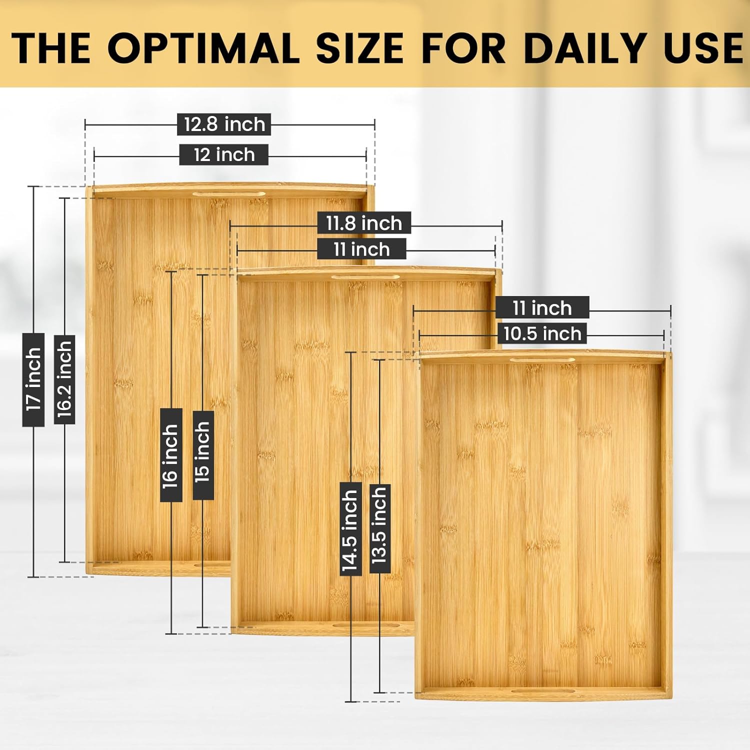 Bamboo Serving Tray with Handles Set of 3 - Decorative Wooden Trays for Eating, Working, and Storing, Suitable for Use in Bedroom, Living Room, Kitchen, Bathroom, Outdoor Scenarios and More