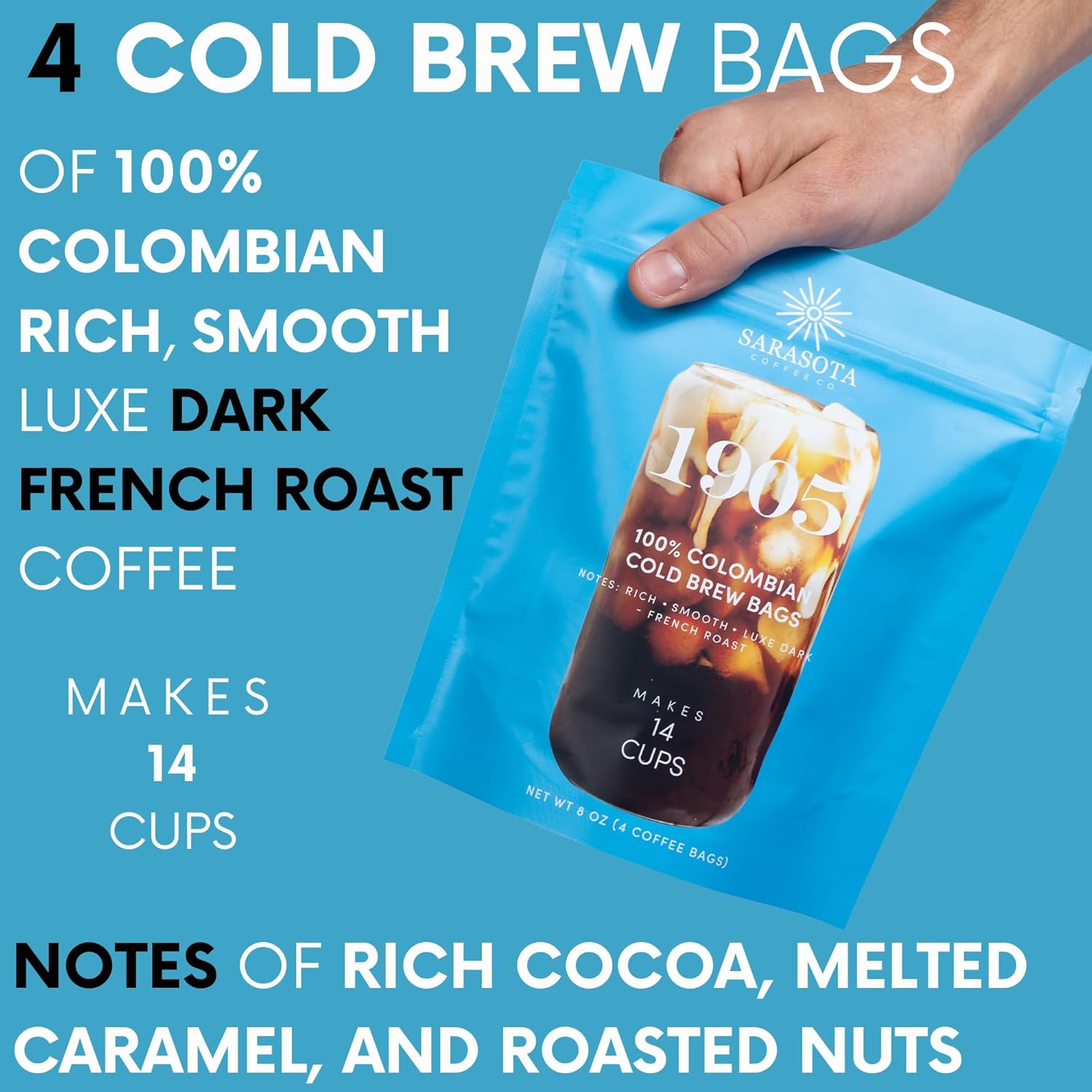 Sarasota Coffee 1905 Cold Brew Coffee Bags | 100% Colombian Dark French Roast | Rich & Smooth | Low Acid Ground Filter Packs | Cold Brew Kit Makes 14 Cups | Bold Luxe Roast Flavor