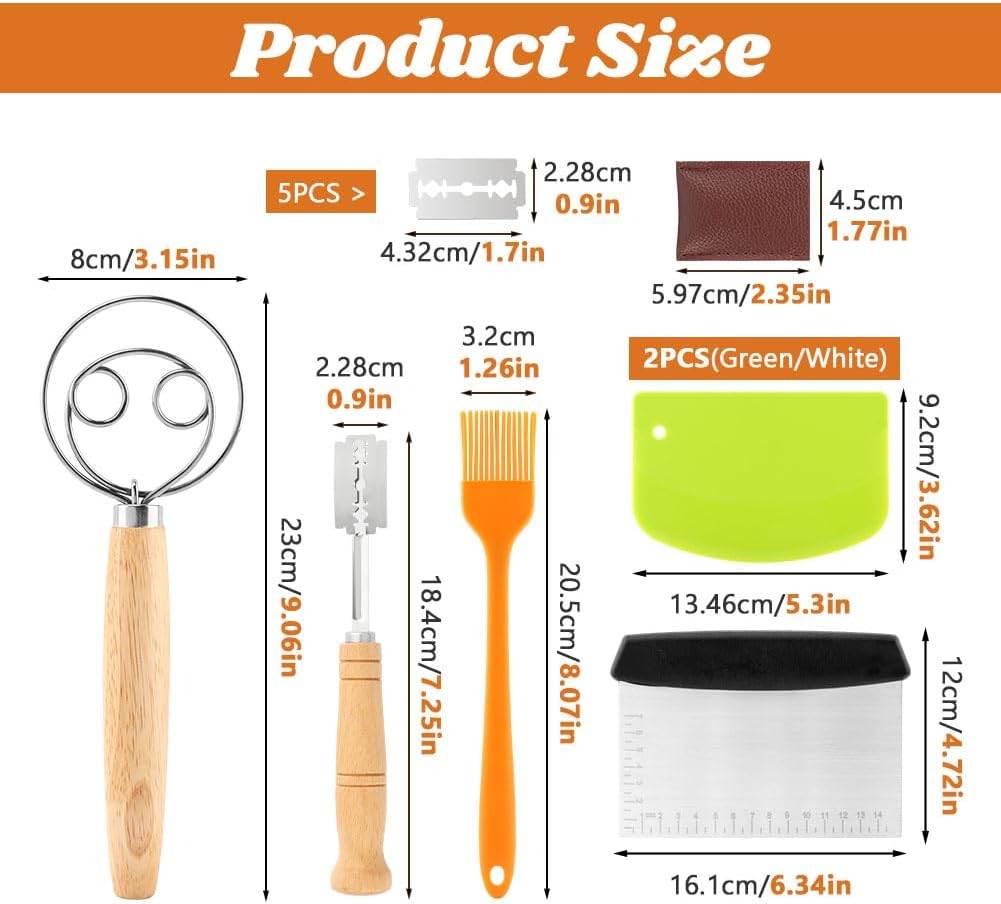 - 【Danish Dough Whisk and Bread Lame Set】This bread making kit includes all the essentials for baking—dough whisk, bread lame, bench scraper, bowl scraper, and pastry brush, It's perfect for both beginners and professional bakers!