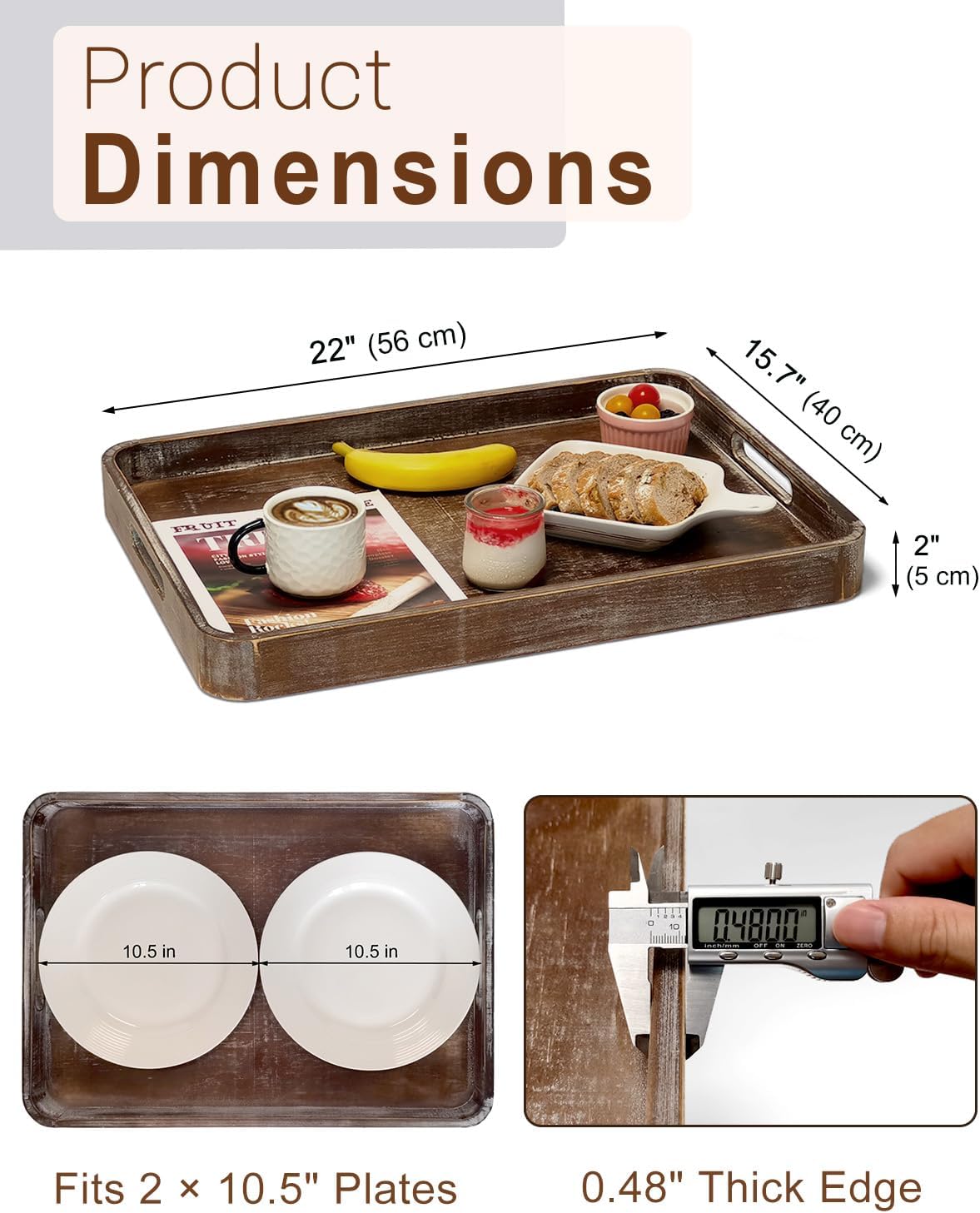 22 Inch Rustic Wood Serving Tray with Handles, Large Rectangular Wooden Ottoman Tray, Beautiful Home Décor for Living Room Coffee Table Couch, Ideal for Serving Food Breakfast BBQ Parties