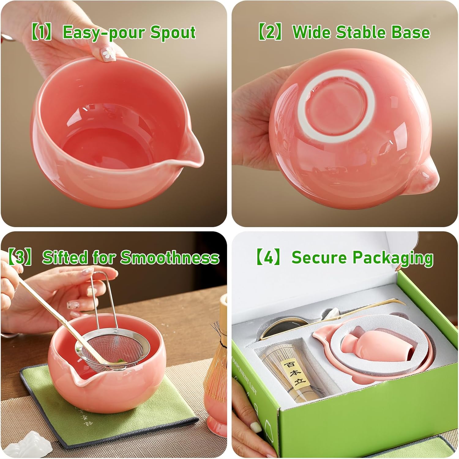 - 7-Pcs Matcha Whisk Set Include: 1*500ml/18oz Ceramic Matcha Bowl with Spout (chawan) , 1*Bamboo Whisk, 1*Bamboo Scoop (chashaku), 1*Cermaic Whisk Holder, 1*Ceramic Scoop Stand, 1*Cotton Tea Cloth (chakin), 1*Matcha Powder Stainless Sifte