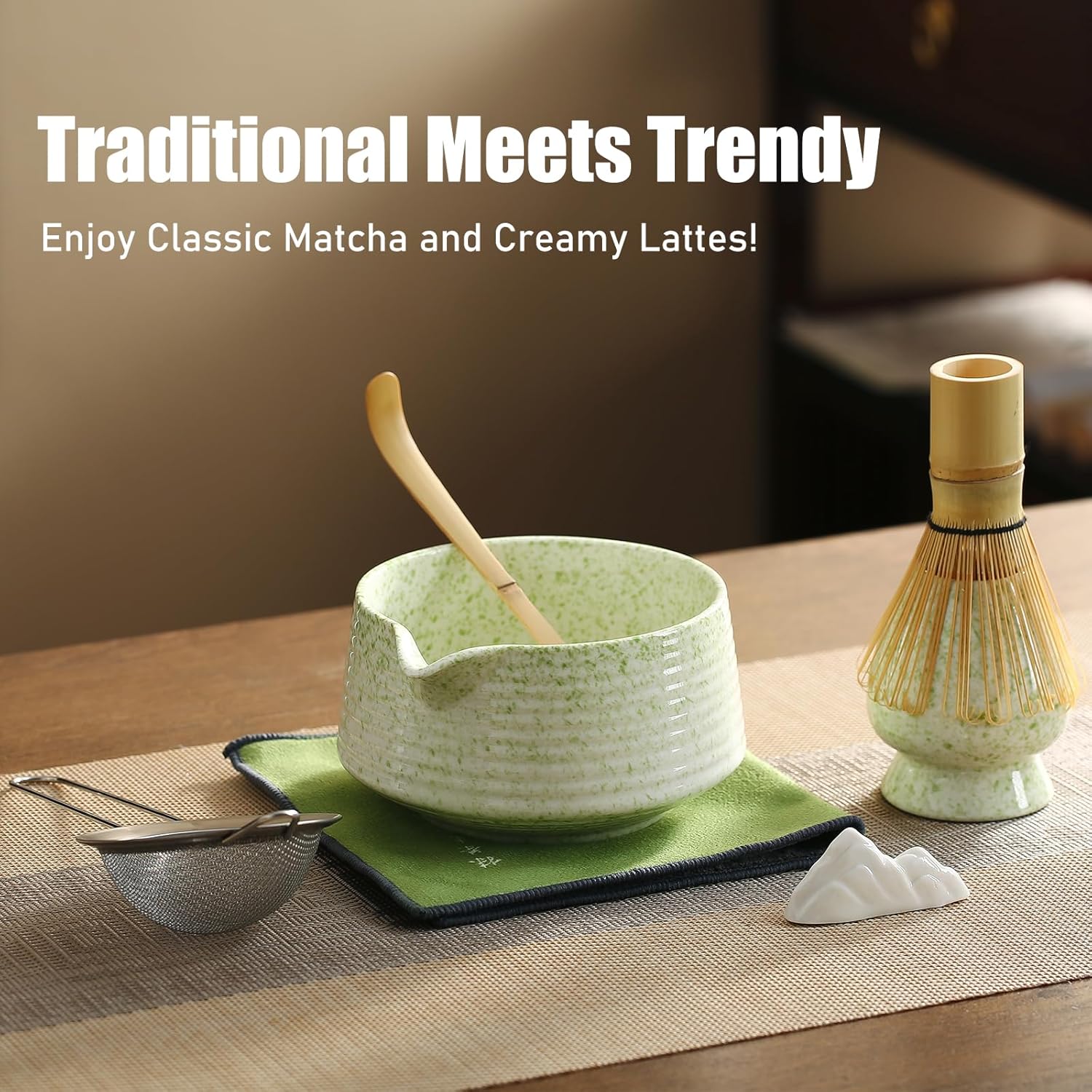 - 7-Pcs Matcha Whisk Set Include: 1*500ml/18oz Ceramic Matcha Bowl with Spout (chawan) , 1*Bamboo Whisk, 1*Bamboo Scoop (chashaku), 1*Cermaic Whisk Holder, 1*Ceramic Scoop Stand, 1*Cotton Tea Cloth (chakin), 1*Matcha Powder Stainless Sifte
