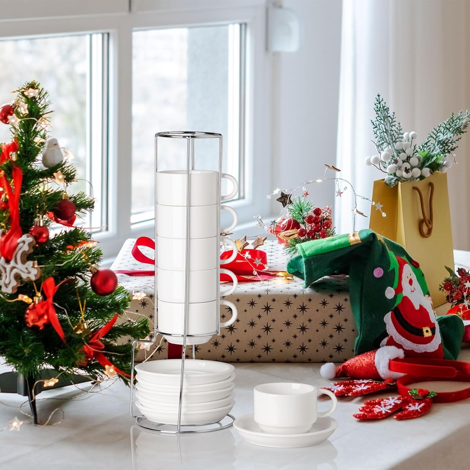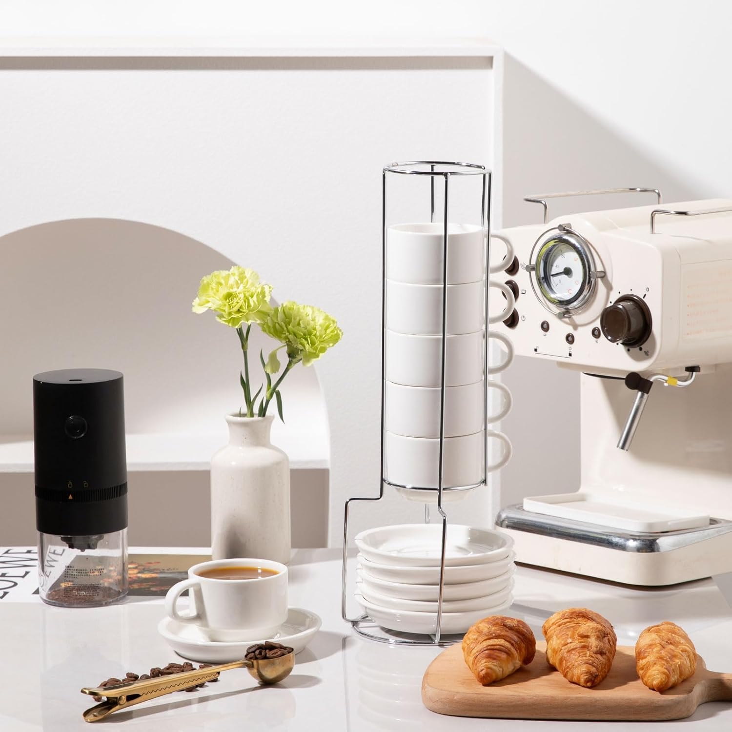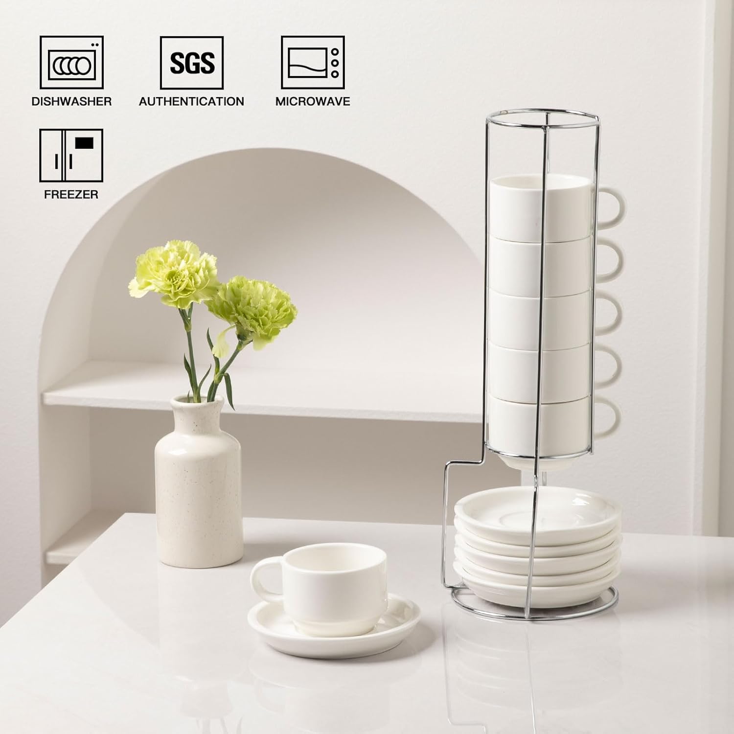 Sweejar Ceramic Espresso Cups Set of 6, Espresso Cup Stackable, 4 Oz Stackable Cappuccino Cups with Saucers and Metal Stand for Coffee Drinks, Americano, Latte, Tea (White)