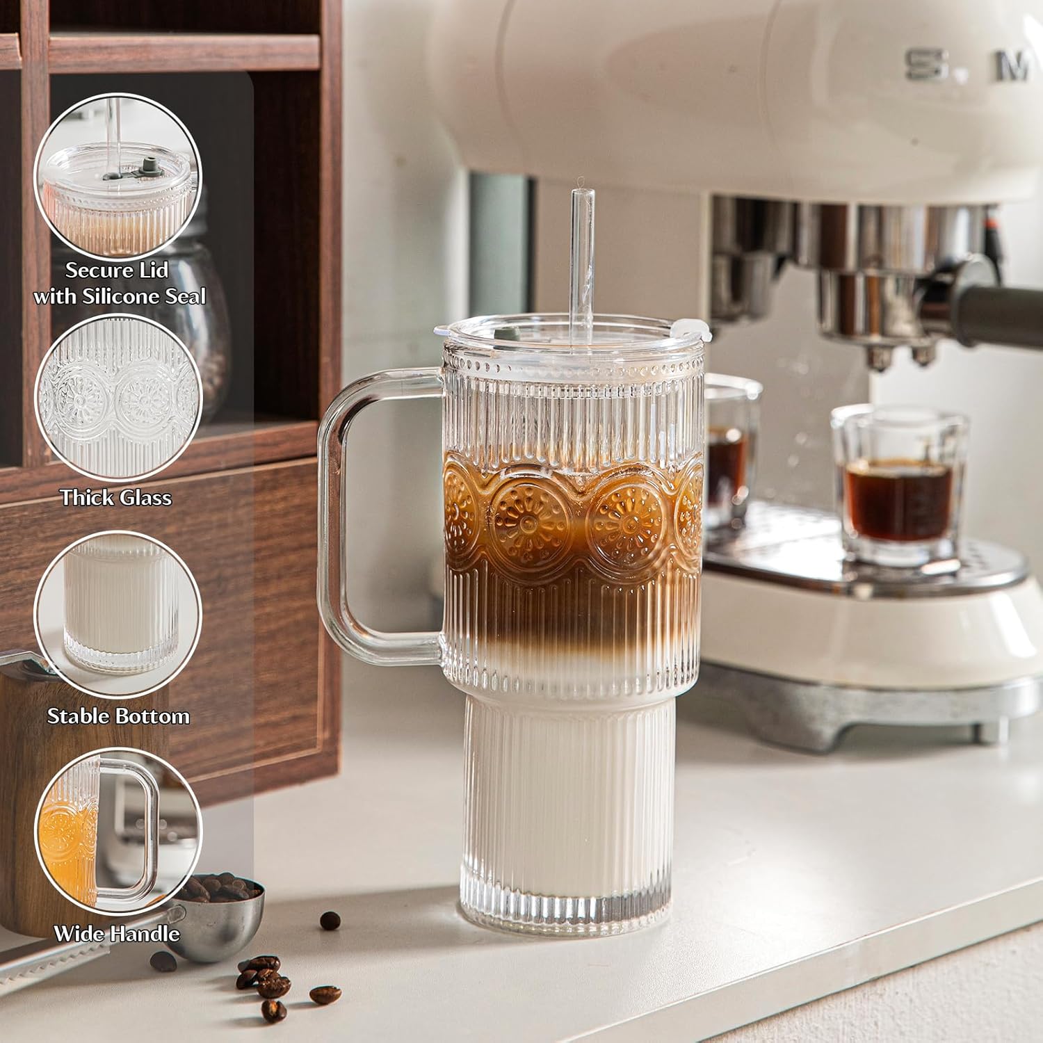 - 【Elegant Ribbed and Embossed Floral Design】 Featuring a timeless ribbed texture paired with a beautifully embossed floral pattern, these glass cups with lids and straws offer the perfect blend of vintage charm and modern elegance. Whether displayed in your home or office, they elevate the aesthetic of any space and add joy to every sip.
