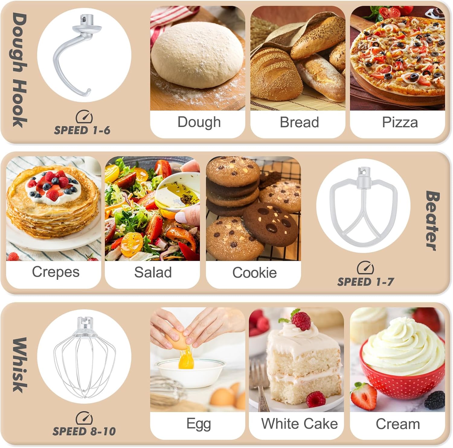 - 【Durable Attachments & Dishwasher Safe】As a versatile food mixer it includes coated aluminum dough hooks & beaters, plus a stainless steel whisk for lasting performance. All attachments snap on and off in seconds for quick changes during baking. The stainless steel bowl and all attachments are dishwasher safe (top rack recommended), ensuring quick and hassle-free cleanup.