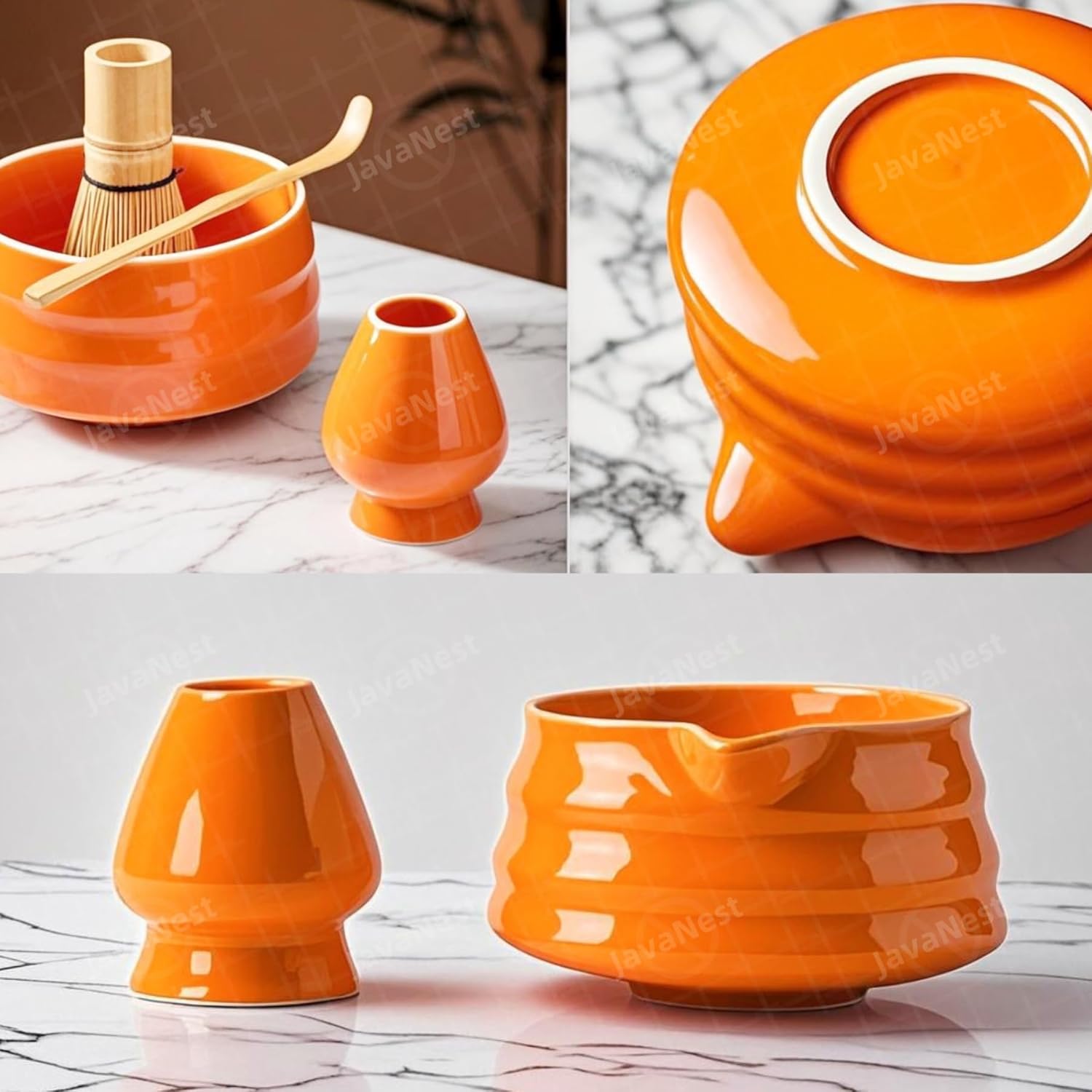 7-Piece Matcha Tea Set with Gift Card – 120-Prong Bamboo Whisk, Ceramic Bowl with Spout, Whisk Holder, Scoop, Spoon, Strainer & Scoop Holder – Ideal Gift for Matcha Lovers (Orange)