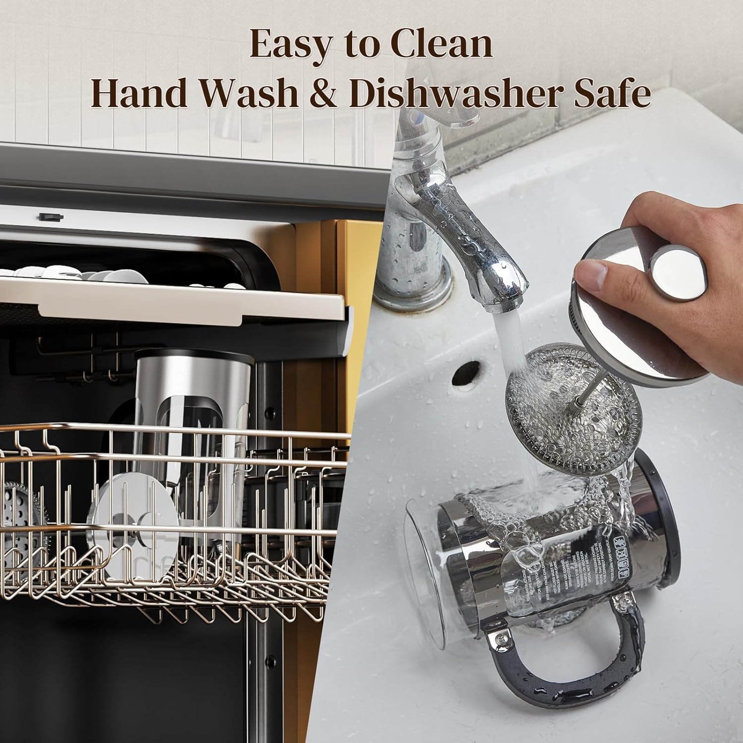 - Easy to Clean: Designed for hassle-free cleanup, the glass carafe disassembles easily for handwashing, while key components like the plunger and filter are dishwasher-safe—ensuring a thorough, convenient clean after every brew