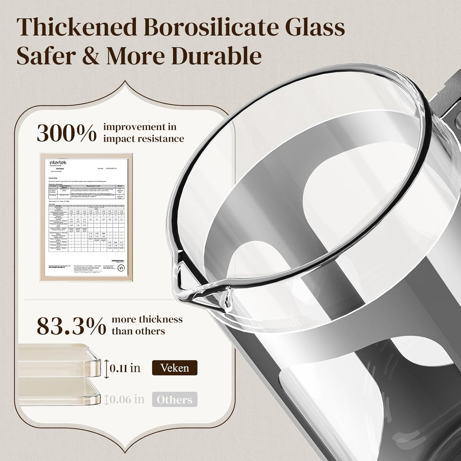Veken French Press Coffee Maker 34oz 1 L, No Plastic Touching Cafe, Heat Resistant Thickened Borosilicate Glass, Stainless Steel Brewer, Cold Brew Cafetera Teapot for Kitchen Travel Camping, Silver