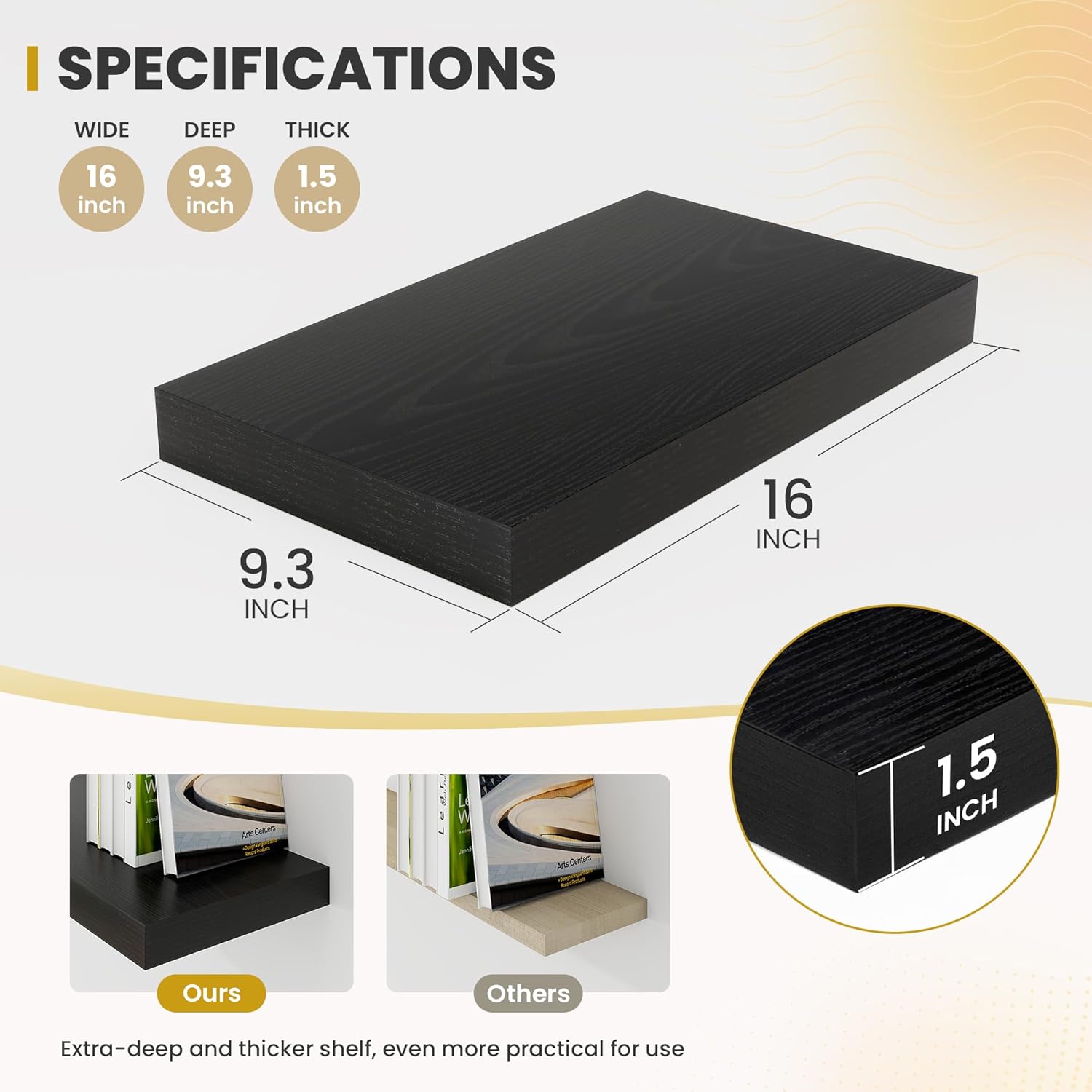 - [SPACIOUS STORAGE SOLUTION]: Featuring an ample 9.3 inch depth, these deep floating shelves offer generous space for decor and essentials. Their wide surface can accommodate books, photos, plants, and more, providing a stylish and practical display. At 1.5 inches thick, they add visual weight and depth, making them a functional focal point on your walls.