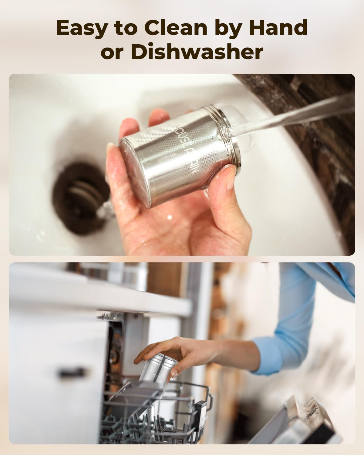 - Upgraded Micron Mesh: The mesh of the House Again large tea filters, thanks to a more advanced perforation process, can be micron-sized to trap the smallest tea particles. No tea dregs to bother you. Loose leaf tea steeper is Ideal to hold tea leaves, particles, or ground coffee