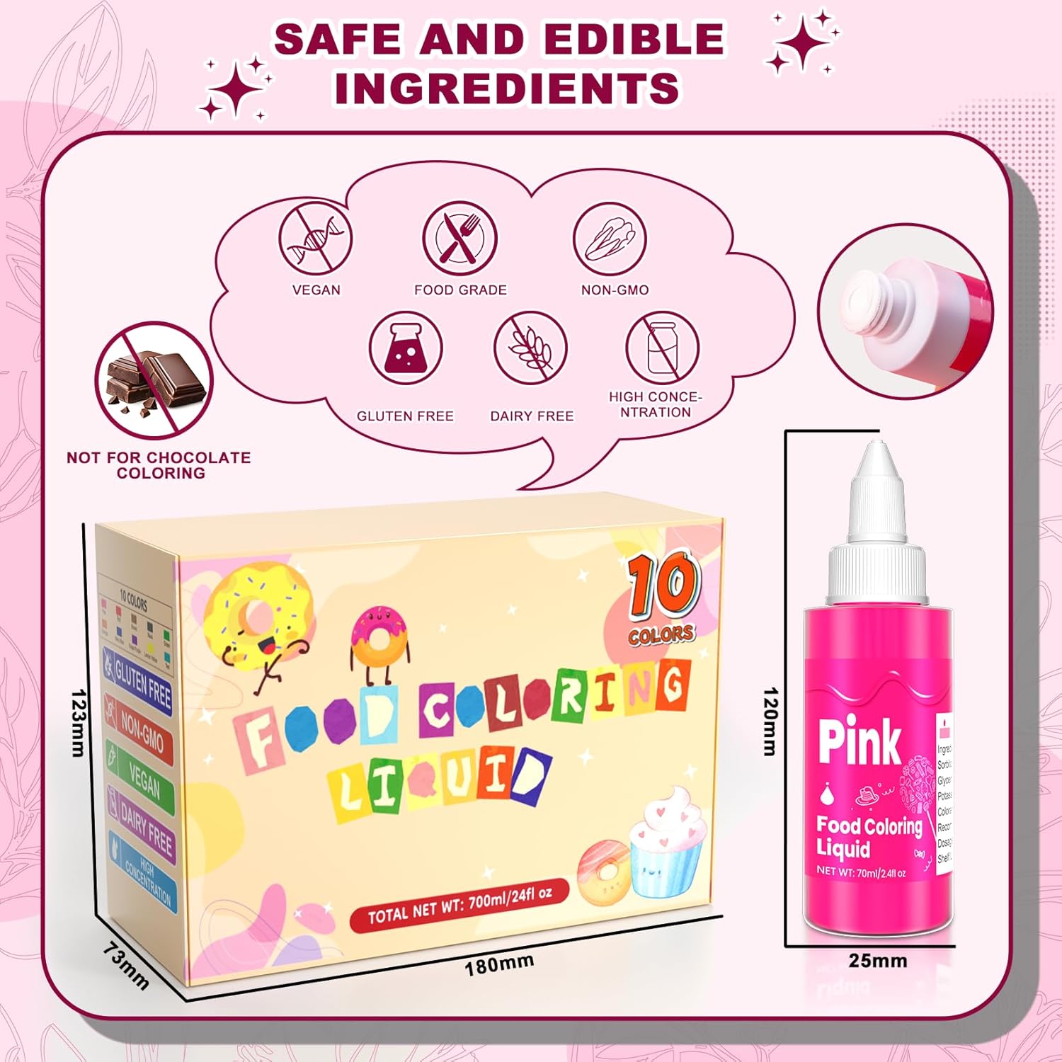 Food Coloring Liquid -10 Colors x 70ml Food Dye Set, Large Capacity Vibrant Edible Paint for Frosting, Cake Decorations, Easter Egg, Baking, Fondant, Slime Making Kit, Easy to Use - 24 Fl. oz