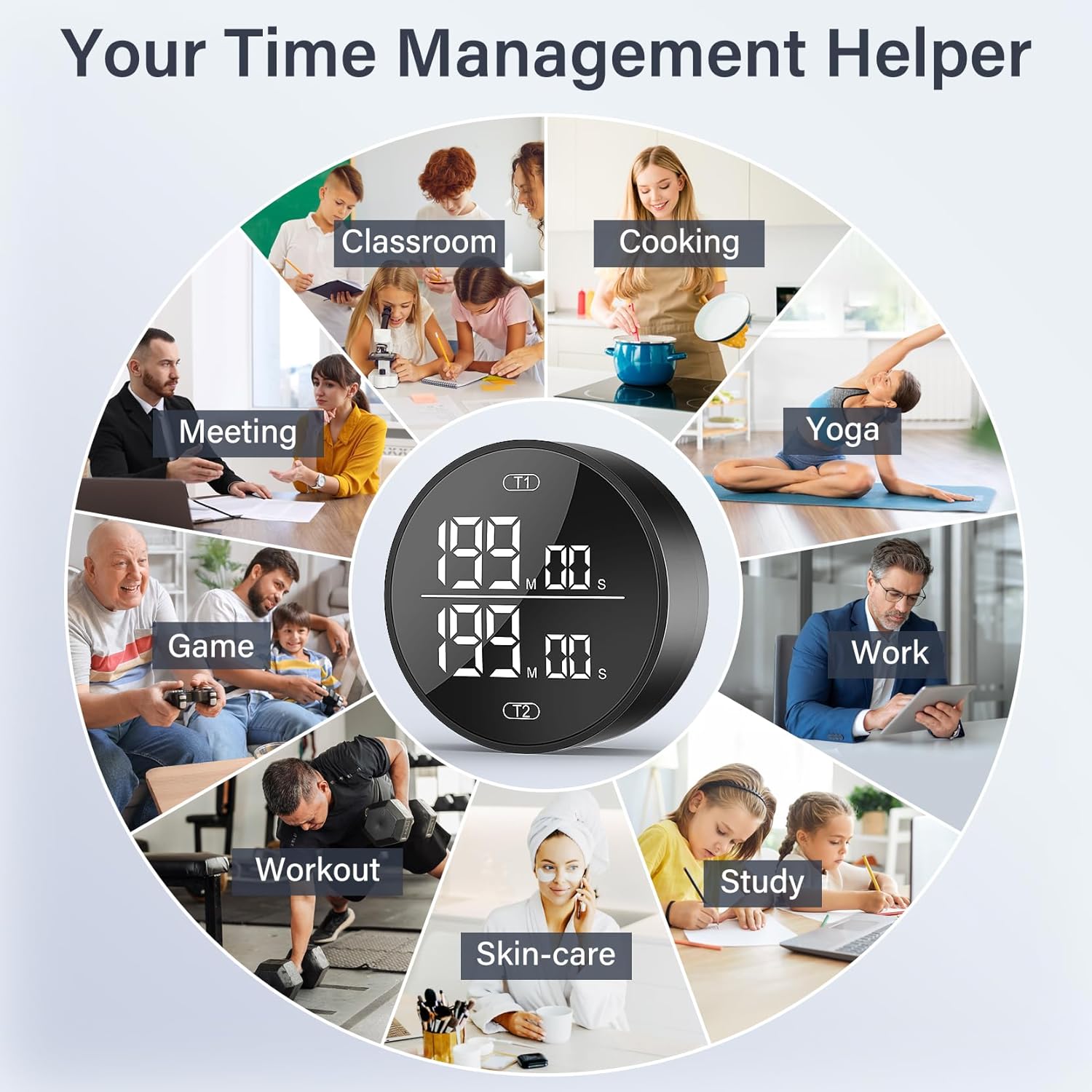 - Dual Channel Kitchen Timer: This device allows 2 timers to work simultaneously without interfering with each other, perfect for multitasking in the kitchen. Featuring a countdown and stopwatch function that can be used simultaneously on the same screen, it is ideal for various scenarios such as cooking, studying, working, meetings, sports, skincare, gaming, and more. The countdown can be set for up to 199 minutes and as low as 5 seconds, while the stopwatch function can track up to 199 minutes and 59 seconds.