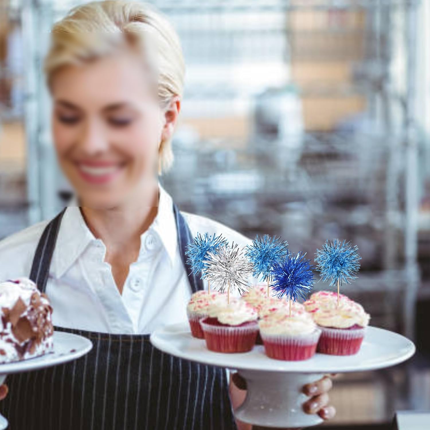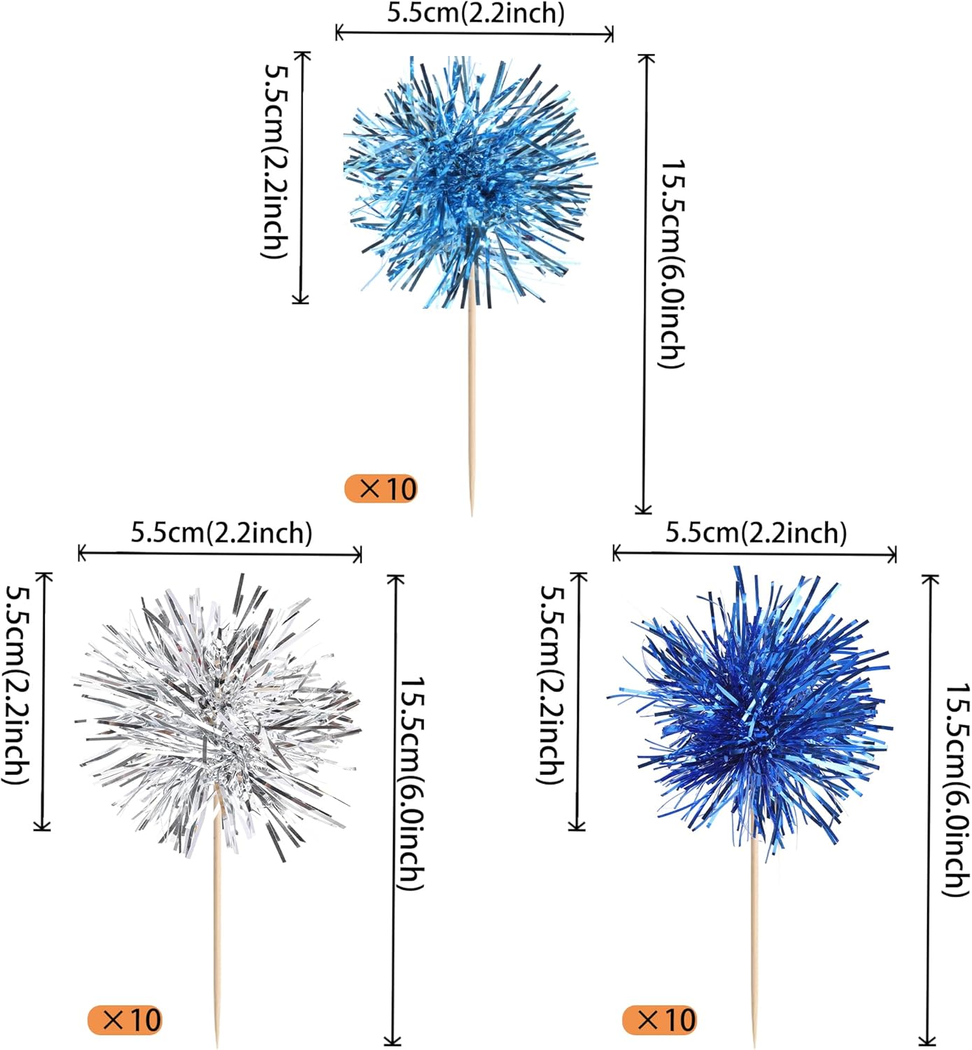 30 PCS Foil Firework Cupcake Toppers Sparkle Tinsel Cupcakae Picks Foil Firework Decorations Cocktail Fruit Toothpick for Fireworks Theme Birthday Wedding Graduation Party Decor Blue Silver Light Blue