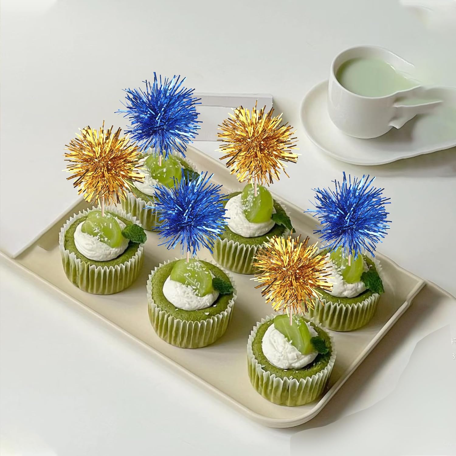 40 PCS Foil Firework Cupcake Toppers Sparkle Tinsel Cupcake Picks Fireworks Birthday Party Decorations Cocktail Fruit Toothpick for Birthday Wedding Graduation Party Decorations Supplies Gold Blue