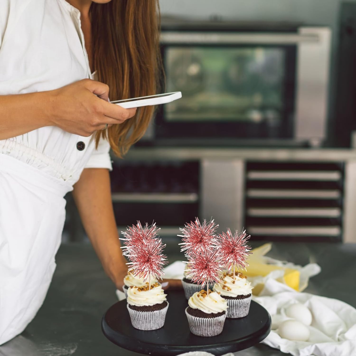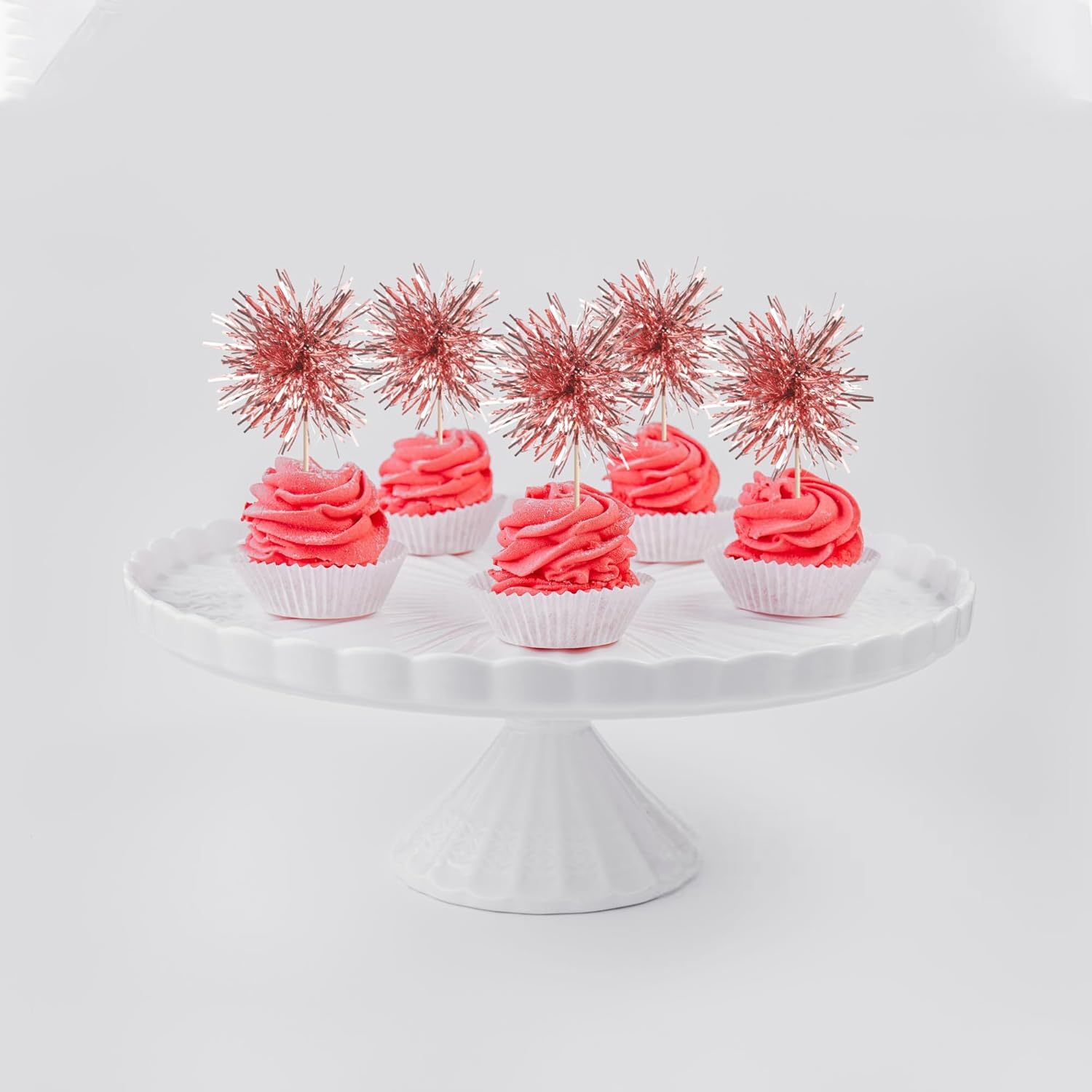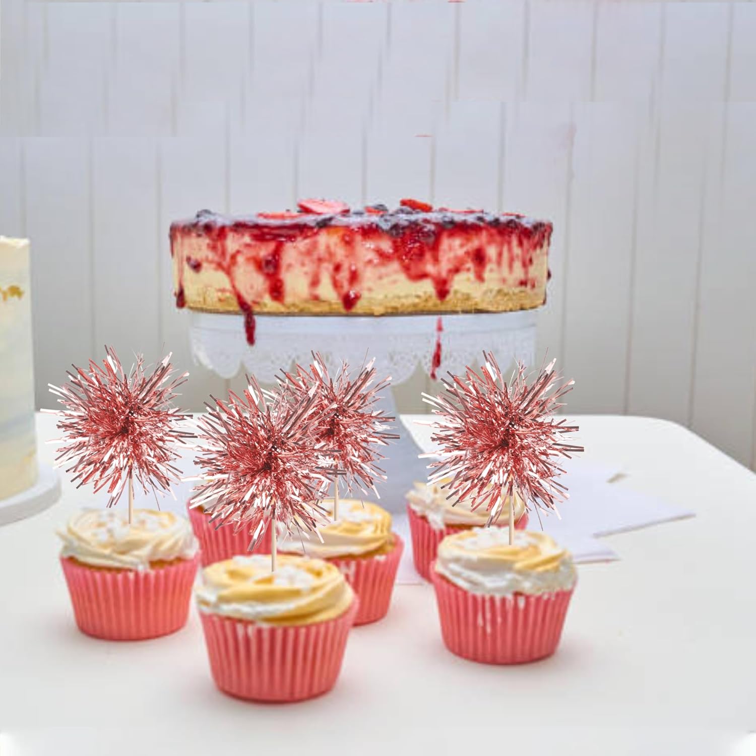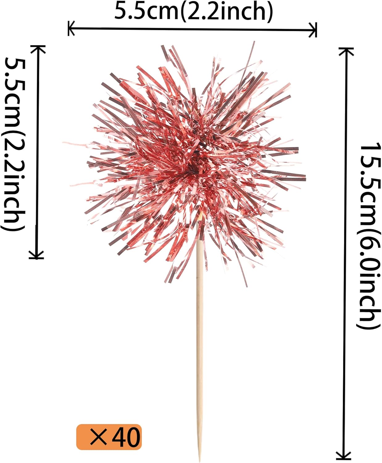 40 PCS Foil Firework Cupcake Toppers Rose Gold Sparkler Cupcake Picks Sparkle Tinsel Fireworks Decorations Cocktail Fruit Toothpick for Firework Theme Birthday Wedding Graduation Party Decor Supplies