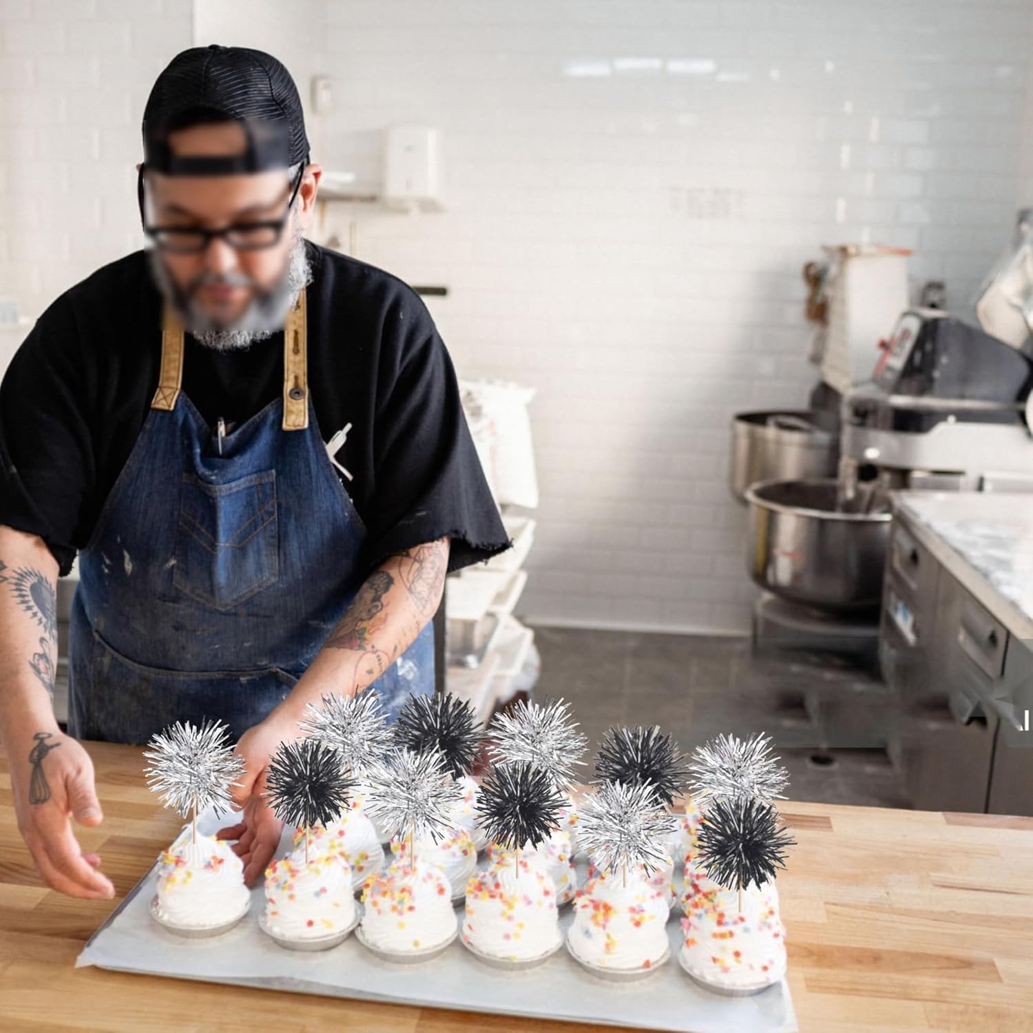 40 PCS Foil Firework Cupcake Toppers Sparkle Tinsel Cupcakae Picks Foil Firework Party Decorations Cocktail Fruit Toothpick for Fireworks Theme Birthday Wedding Graduation Party Decor Black Silver