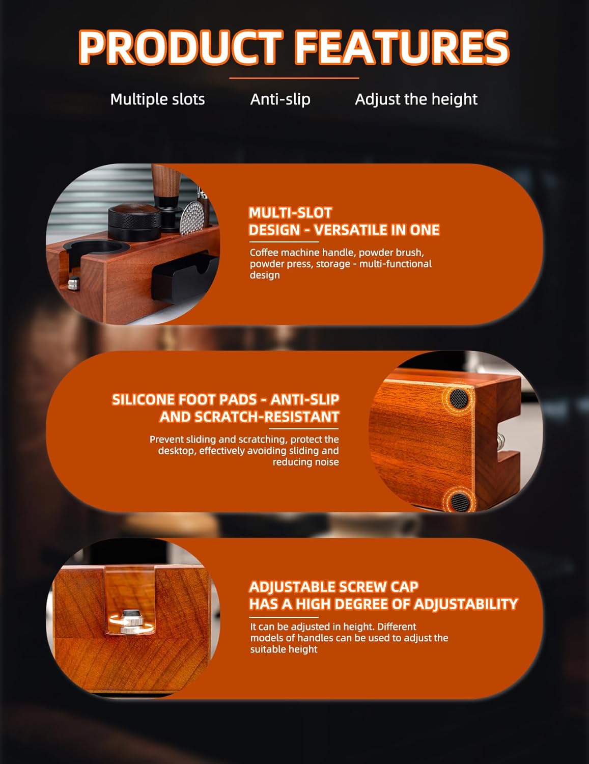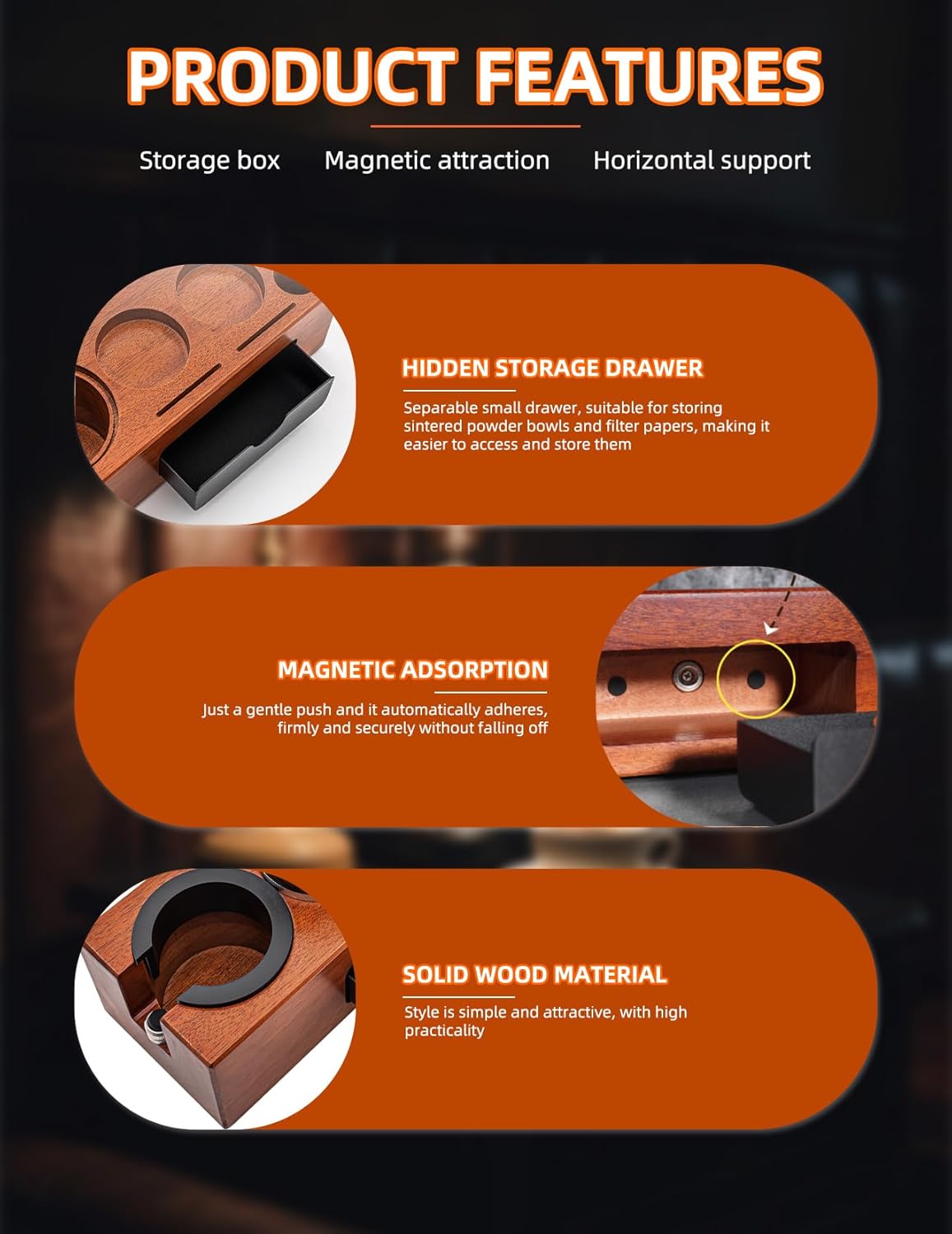 - Multifunctional Coffee Tool: This espresso tamping station combines a deep knock box, magnetic tool slots, and secret drawer organizer in one gorgeous wood block. Ditch scattered coffee accessories – neatly parks your 51, to 58mm tamper, espresso distribution tool, and brewing basket! Fits cramped coffee stations like a glove.