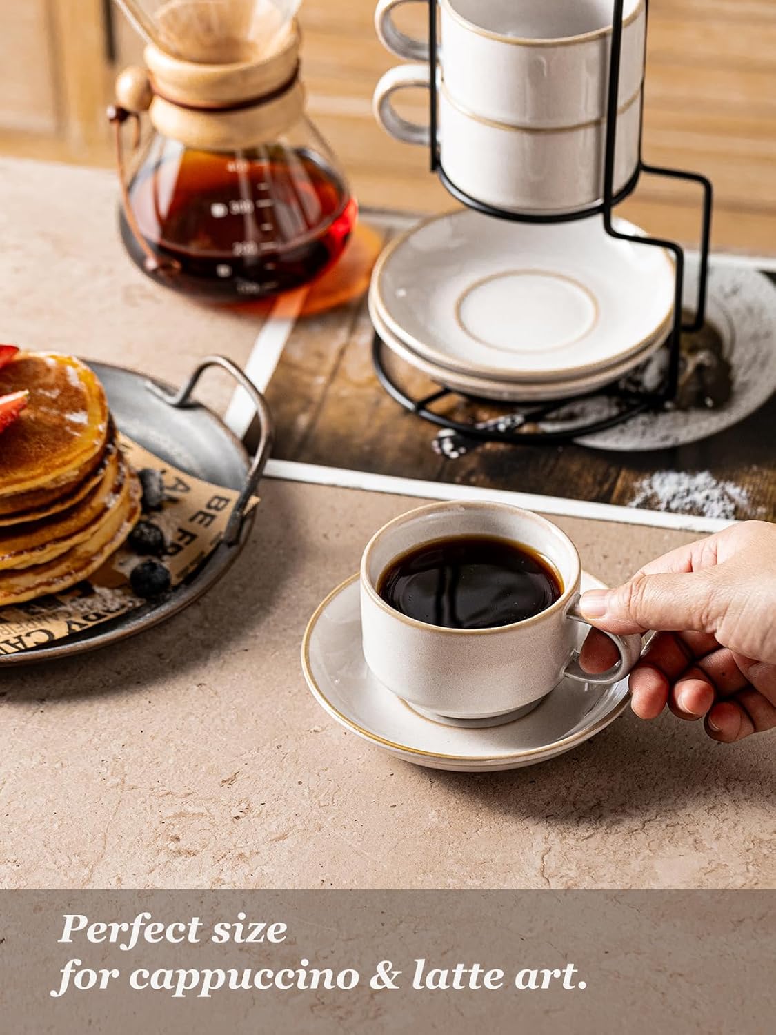- STACKABLE & SAVE SPACE: Maximize counter space! These ceramic espresso cups stack inside of each other in the included metal rack, they are a breeze to store, making them ideal for small kitchens, coffee bars, or dorm rooms. Store vertically, save space!
