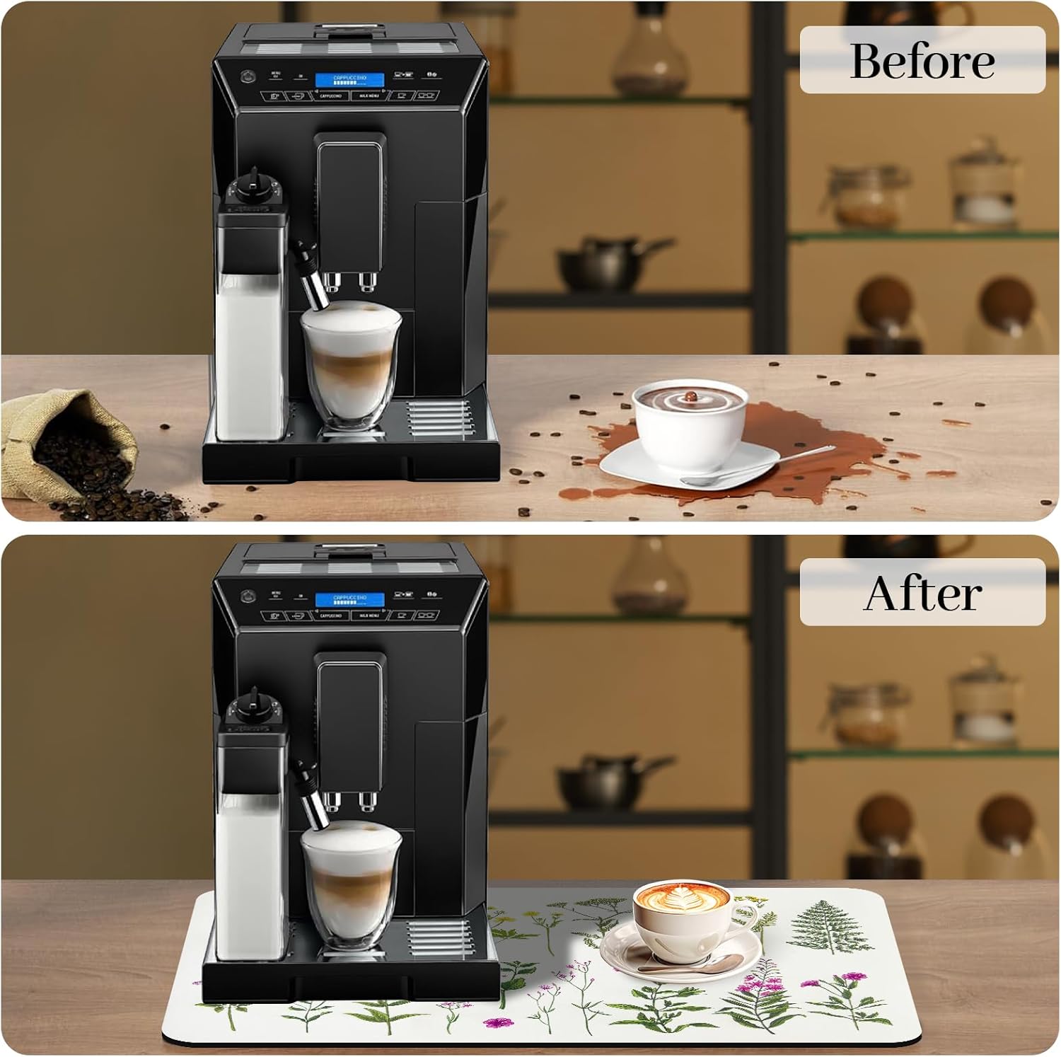 - 【Coffee Maker Mat For Countertops】Keep your coffee maker and countertops clean from spills with a coffee mat. This coffee bar mat protects your kitchen countertop surfaces from coffee splashes or coffee bean stains and can avoid the trouble of cleaning the countertops.