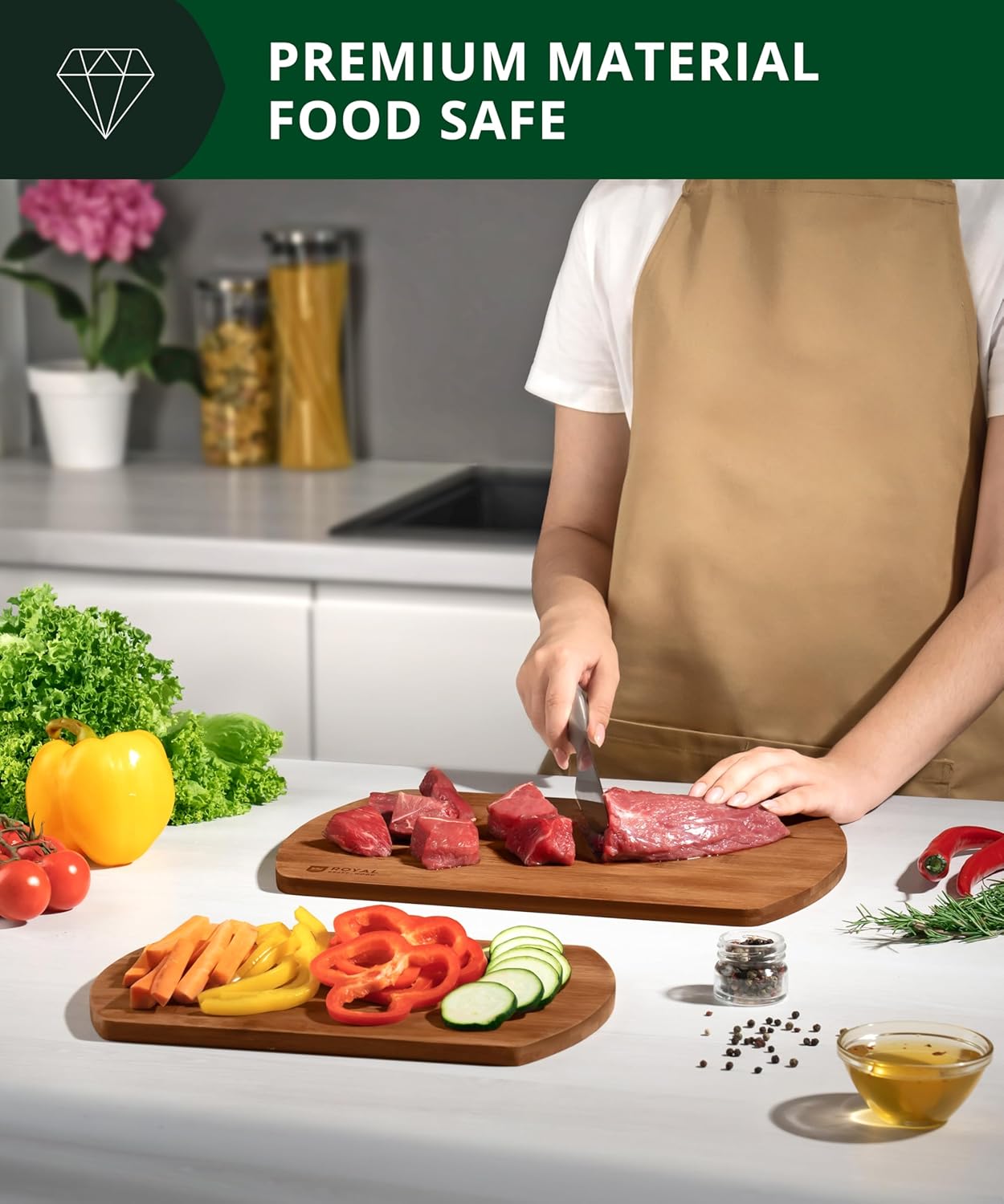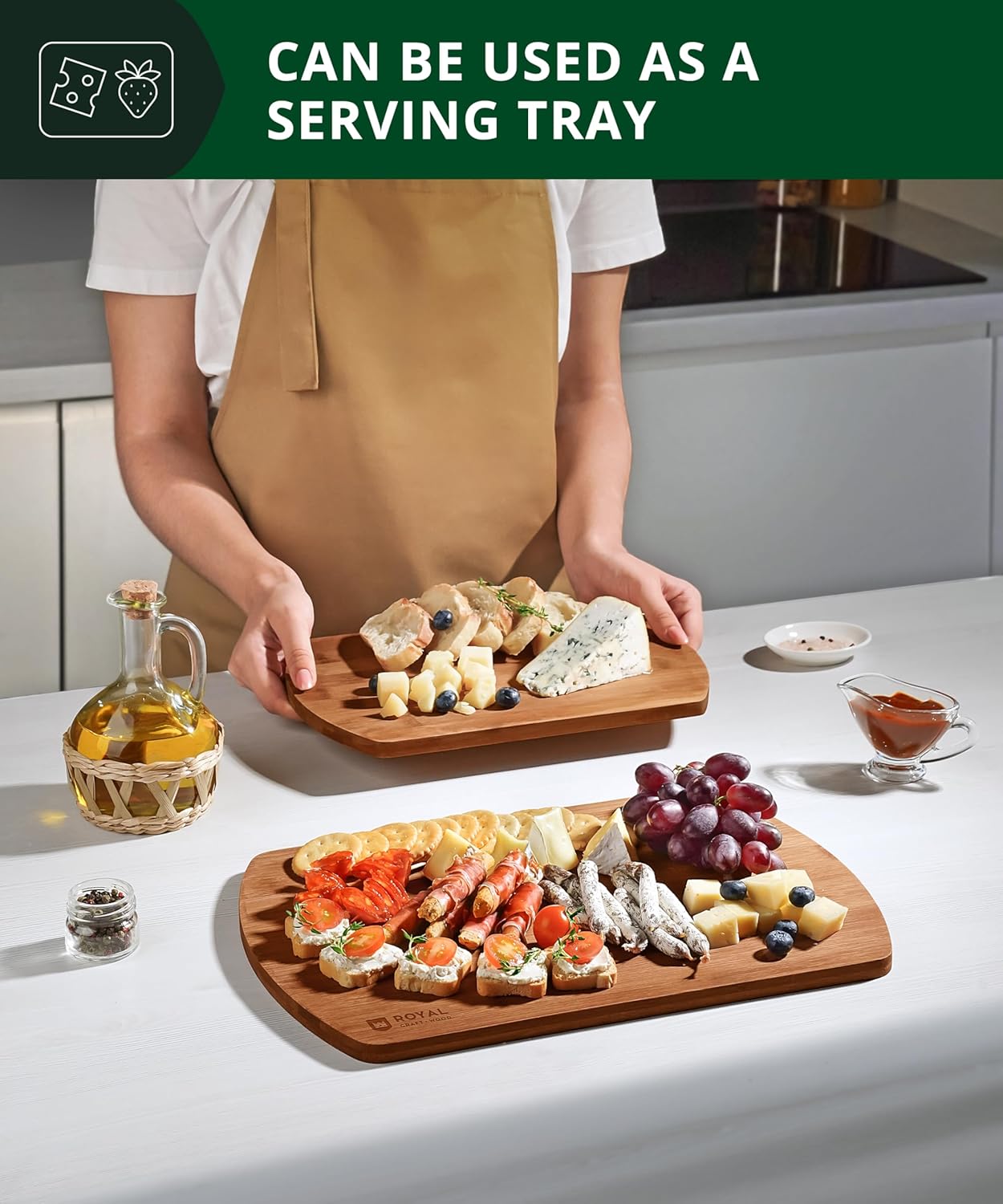 - 𝐄𝐋𝐄𝐆𝐀𝐍𝐓 𝐂𝐔𝐓𝐓𝐈𝐍𝐆 𝐁𝐎𝐀𝐑𝐃𝐒: Our newly designed 2 piece wood serving boards set is super slim & lightweight for easy use & maneuverability. The Royal Craft Wood bamboo chopping boards are available in 12”x8”, and 15”x10” options for your convenience, making this an all in one kitchen essential, allowing you to easily cut, meal prep, & even serve. Use the small board for quick fruit chopping, medium for multiple vegetables & large for slicing meat or for use as a charcuterie board.