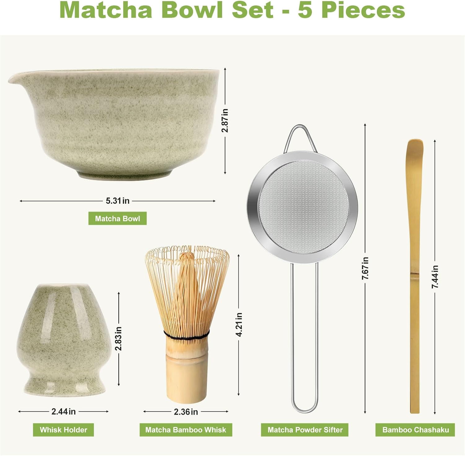Green Matcha Whisk Making Set - Japanese Tea Kit with Whisk Bowl and Bamboo Scoop Ceramic Chawan with Spout for Traditional Tea Ceremony Complete Matcha Making Tools Gift for Tea Lovers (Green, 5 PCS)