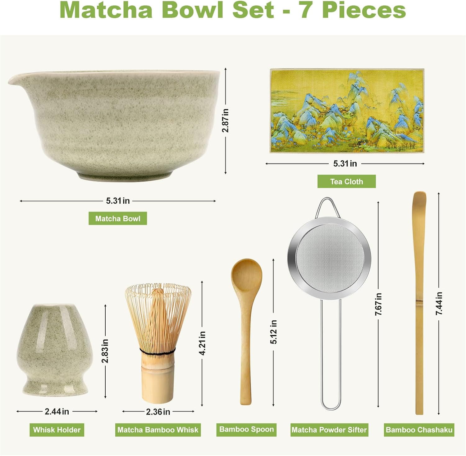 Green Matcha Whisk Making Set - Japanese Tea Kit with Whisk Bowl and Bamboo Scoop Ceramic Chawan with Spout for Traditional Tea Ceremony Complete Matcha Making Tools Gift for Tea Lovers (Green, 7 PCS)