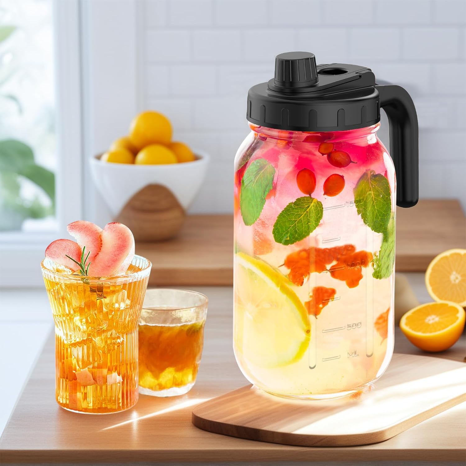 - Airtight & Leak-Proof Design: The airtight lid keeps drinks fresh longer and prevents accidental leaks, whether in the fridge or on the go. Enjoy peace of mind while storing your favorite beverages in this glass mason jar pitcher with lid.