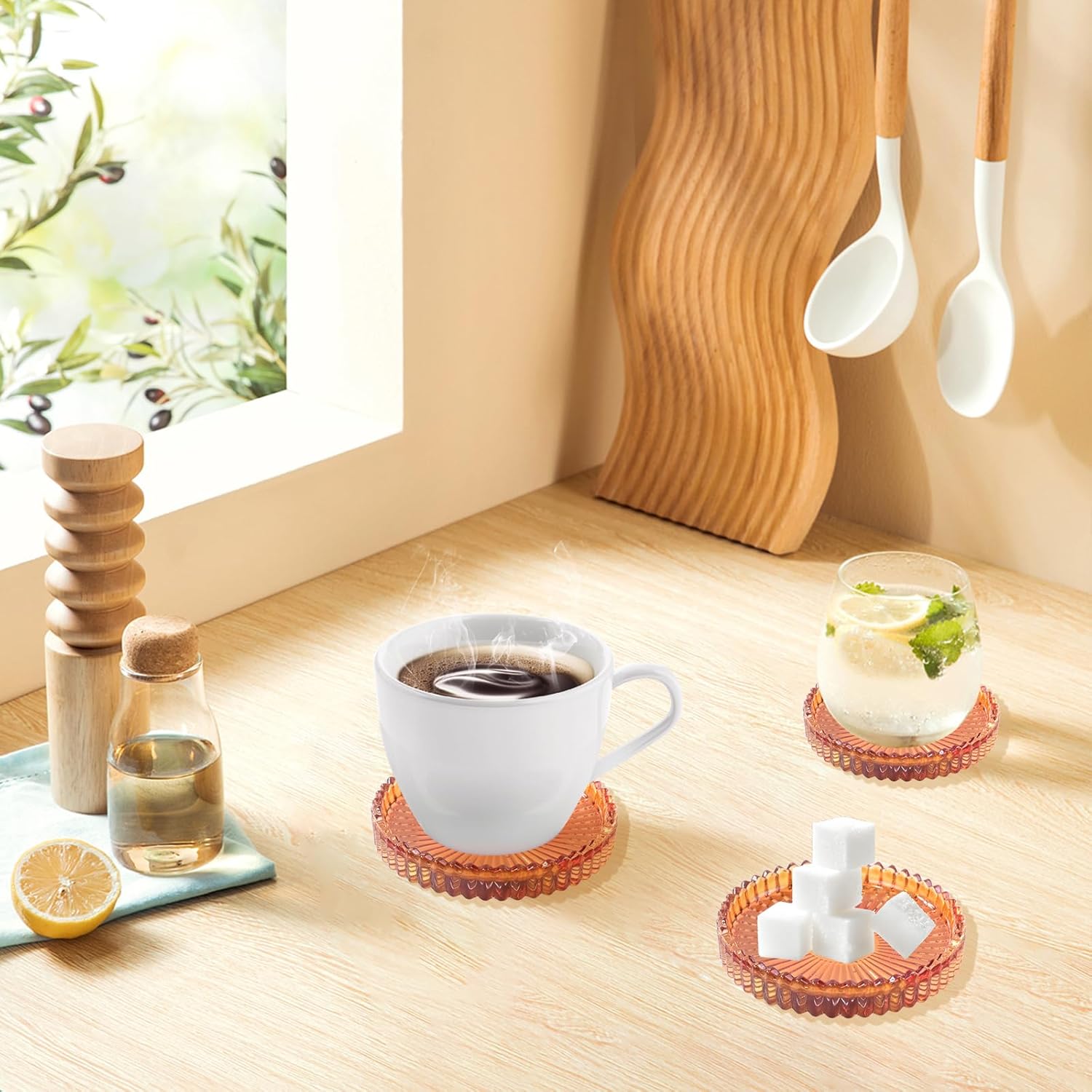 - Full atmospheric exterior- The coasters design simple and modern textures. With a variety of color options make it easy to match home, office, restaurant and other scenes, enhance the desktop style. Decorate your kitchen, living room, dining room, bedroom,patio or outdoors party. Attractive and stylish round coasters for drinks, glasses, water, soda, cups, and mugs. and have both practicality and decorativeness. And the glass coasters can also serve as a storage box for small accessories, candles, and create a romantic atmosphere.
