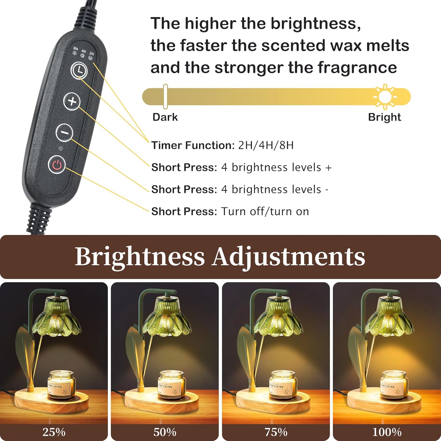 - ❀ [Dimmable & Timer] The candle lamp warmer has adjust the brightness, short press the brightness +/- to adjust the brightness mode (25%-50%-75%-100%), or long press the brightness +/- for stepless dimming, the higher the brightness the faster the candles melt. and the Candle+Warmer+Lamp has a convenient 2/4/8 hour timer function, which can customize the time according to your preference, so that you can go into the sweet dreams with peace of mind