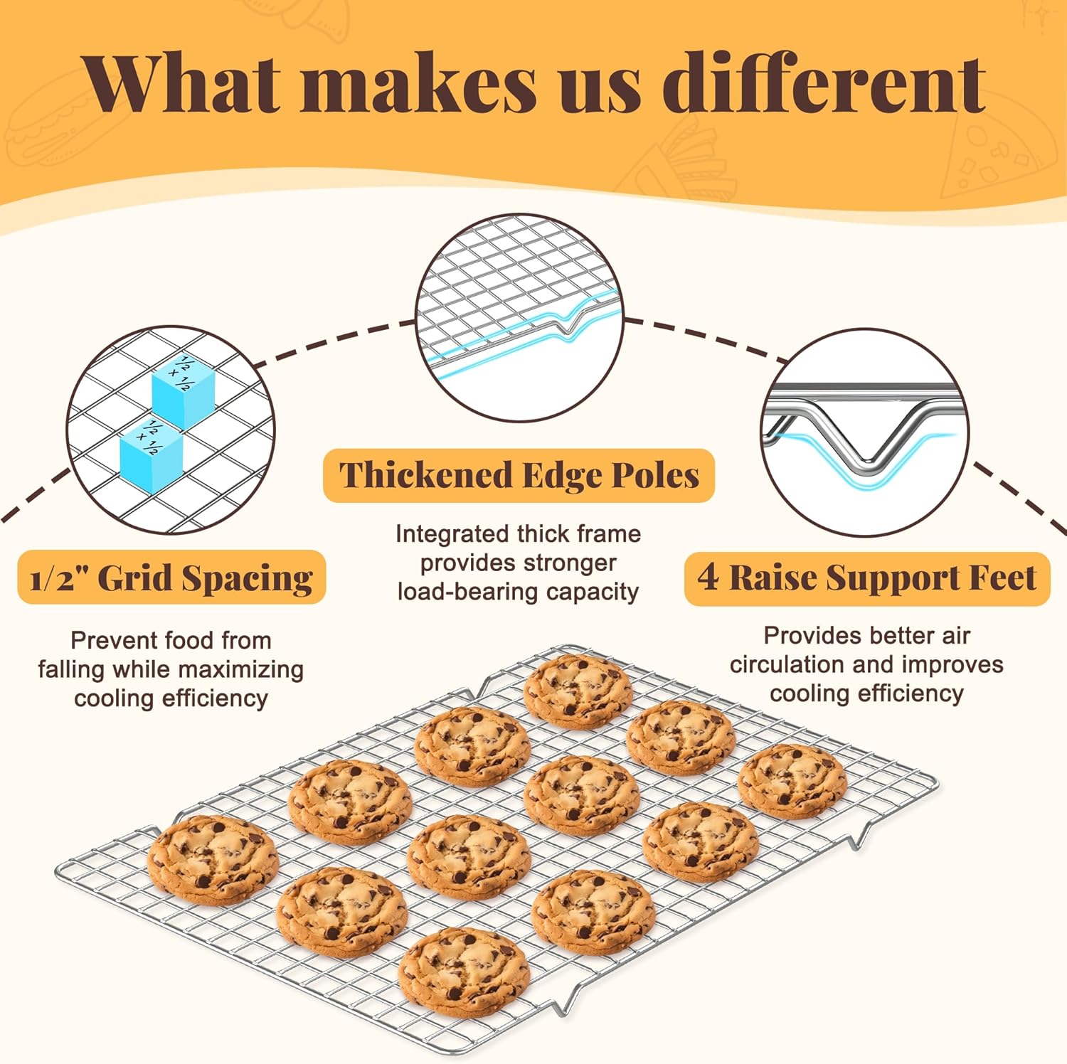 - STURDY STAINLESS STEEL CONSTRUCTION: Our baking cooling rack is made of quality materials, prevents bending or deformation when carrying heavy loads. Smooth polished surface of cookie cooling rack without coating or plating, no burrs, no rust, no peeling, protect your daily food safety
