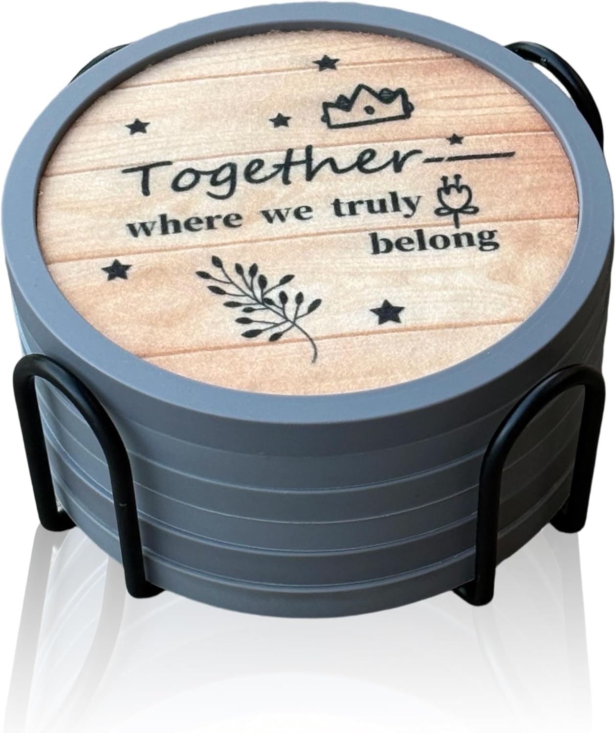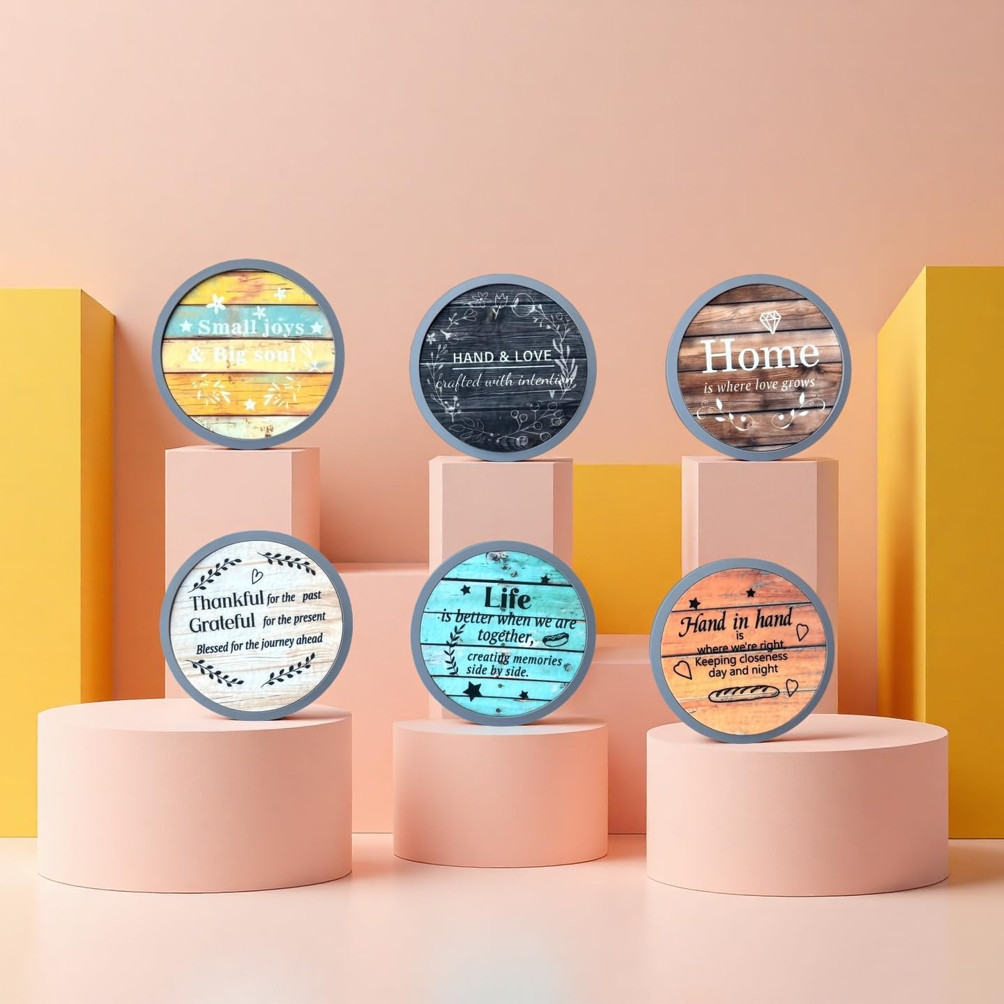 - 12 Unique Double-Sided Designs: Warm “Home” Themes 12 distinct patterns and quotes (6 coasters × 2 sides) that celebrate comfort, love, and everyday warmth—think cozy phrases, rustic home motifs, and charming farmhouse details. Rotate the coasters to switch up the look: Match them to your mood (a quiet evening in, a weekend brunch with friends) or your decor for a fresh touch.