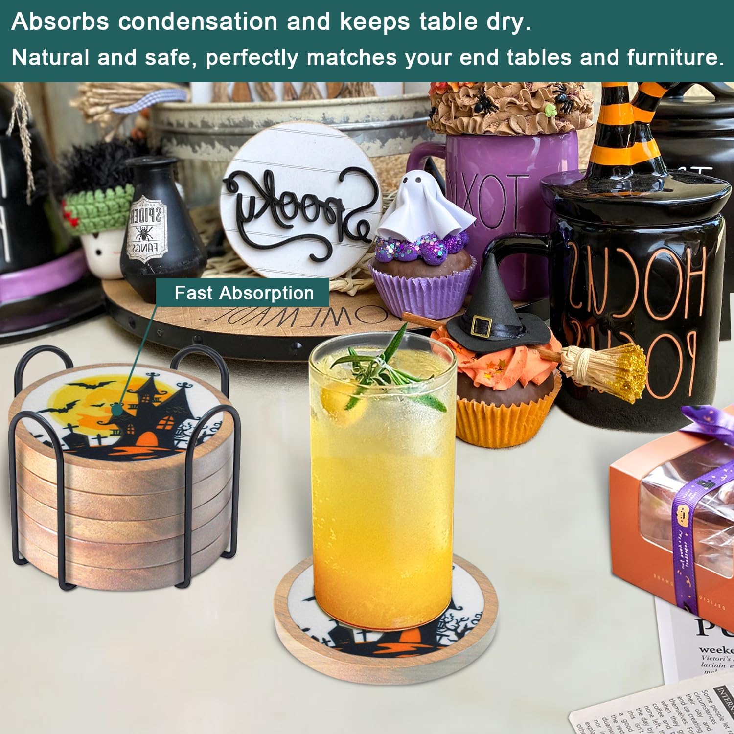 Halloween Coasters Set of 6, Unique Coaster, Minacun Absorbent Coasters with Holder Halloween Thanksgiving Themed Party Decoration 4.3 Inch