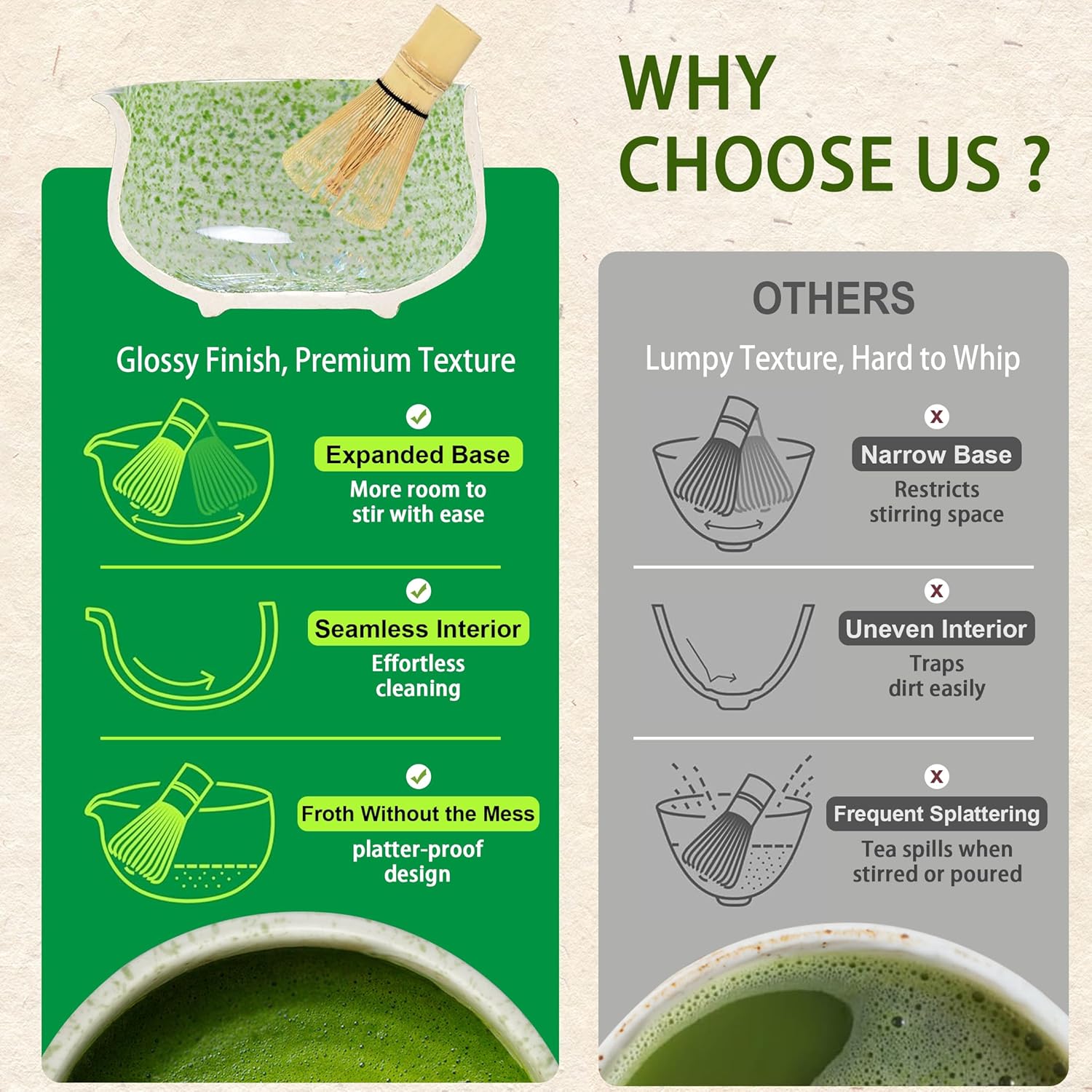 - 【Elevate Your Matcha Ritual】Our matcha bowl with spout boasts a clever "yingzui" design that prevents spills, keeping surfaces neat even during the most immersive tea ceremonies. The handcrafted matcha whisk, finely tuned with ideal tine spacing, whips up rich, velvety foam that elevates matcha's smooth, silky texture. This high-quality matcha set adds elegance and perfect flavor to every afternoon Japanese tea ritual and evening family get-together.