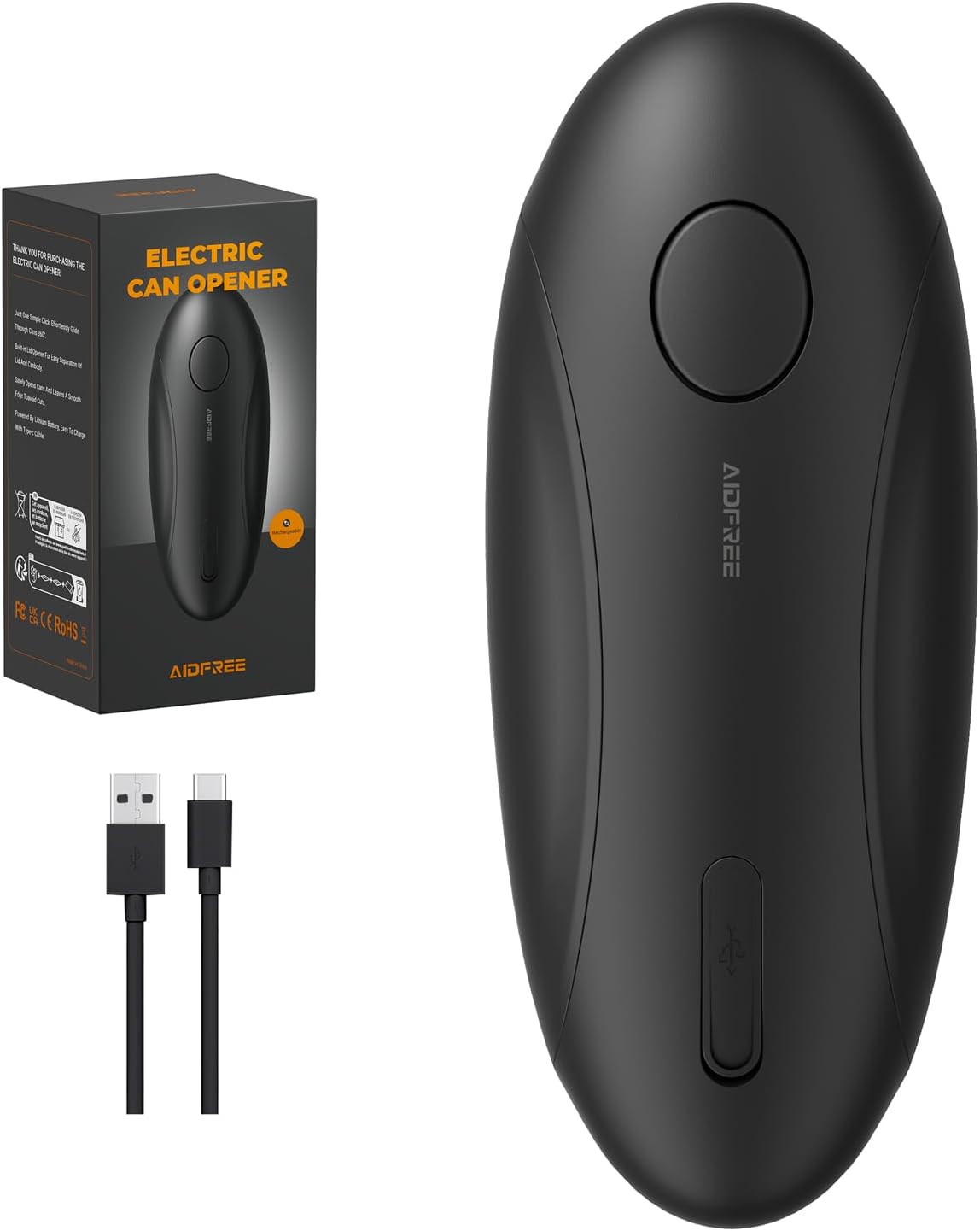 - One-Touch Simplicity:3 Steps easy to use Aidfree electric can opener;align, press, and relax;our sleek, high-tech design enables fast,stable,and whisper-quiet cutting cans with a single touch;No straining, no slipping—just effortless hands-free operation from start to finish