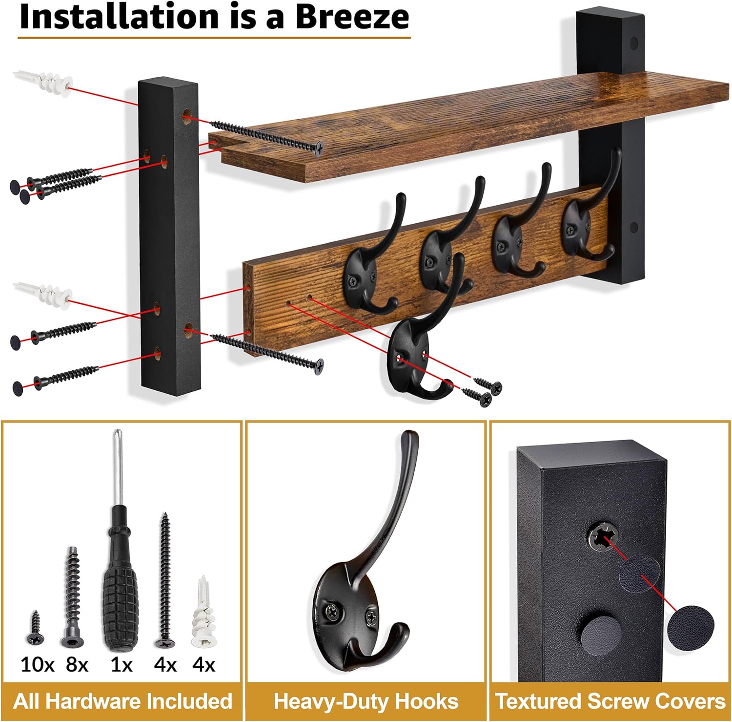 - Heavy-Duty Metal Hooks – The Shelf is made of beautiful engineered faux wood (not solid wood) featuring a smooth matte finish. Equipped with 5 metal sturdy dual hooks, our wall mount coat rack holds everything from coats to backpacks to bathrobes – built to last and resist bending, cracking, or slipping.